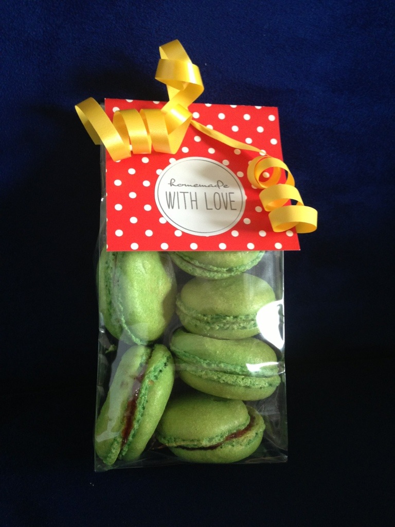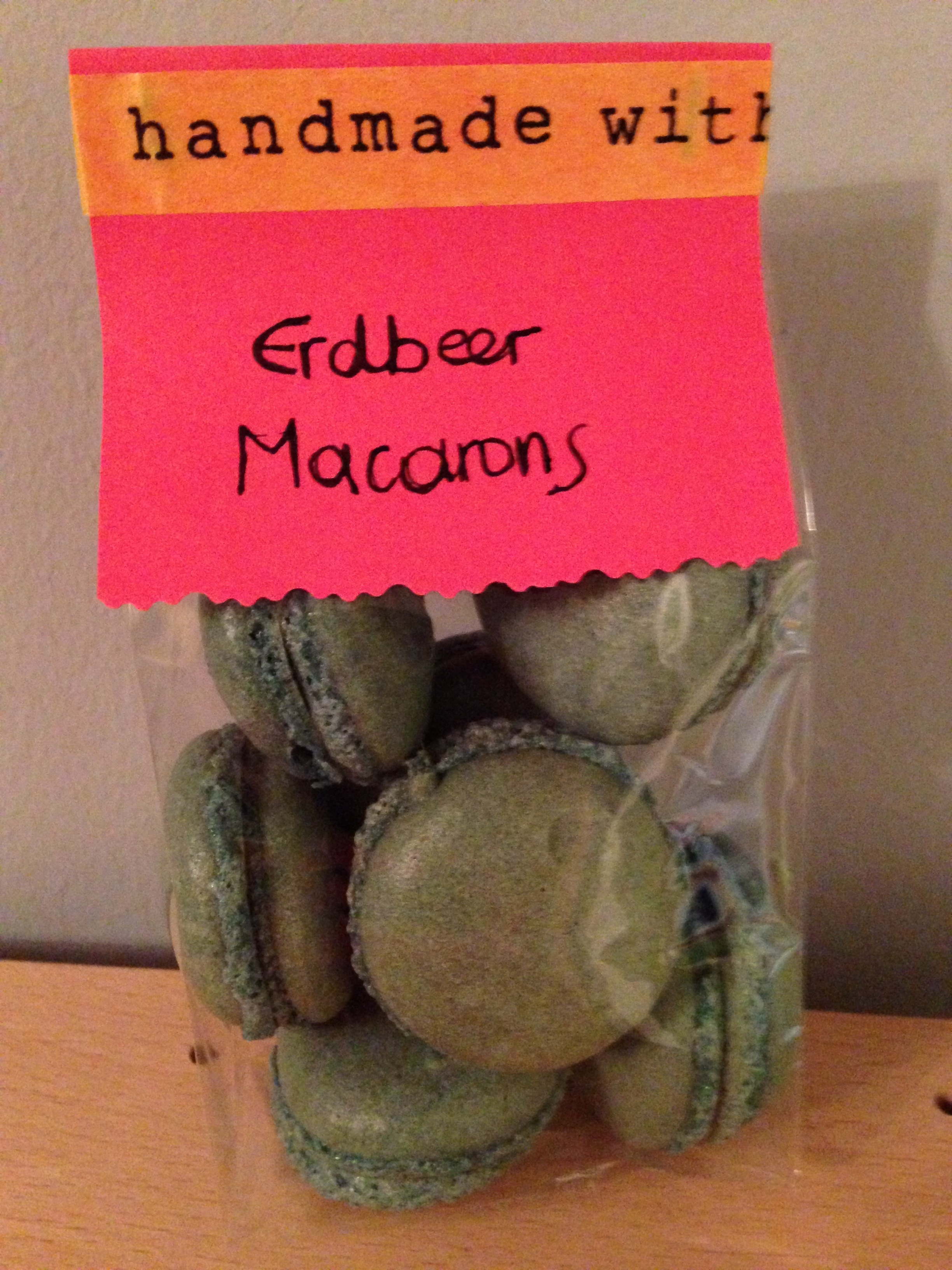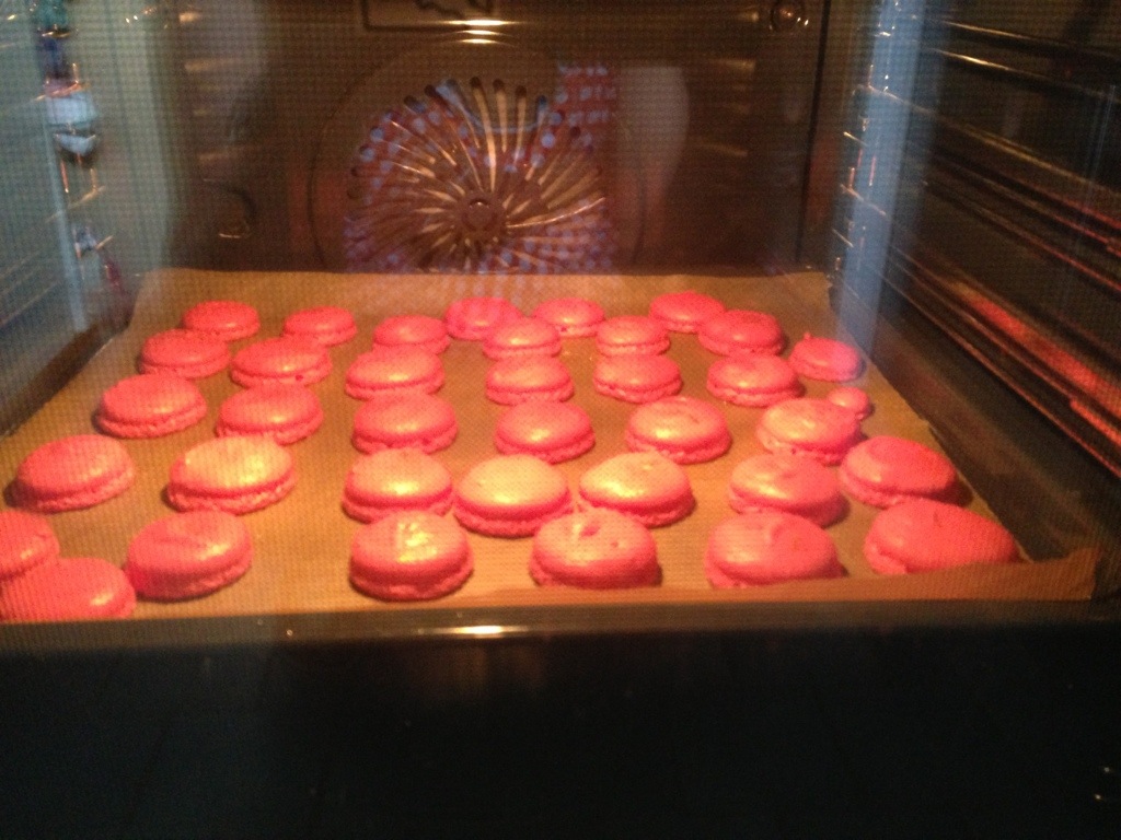 In der Zwischenzeit die Füllung vorbereiten: ca. 5-6 EL Marmelade (zB Erdbeere) im Topf warm machen. Anschließend auskühlen lassen und auf eine Macaronhälfte einen Tupfer raufgeben. Zweiten Macaron drauf geben und fertig ist der Macaron.