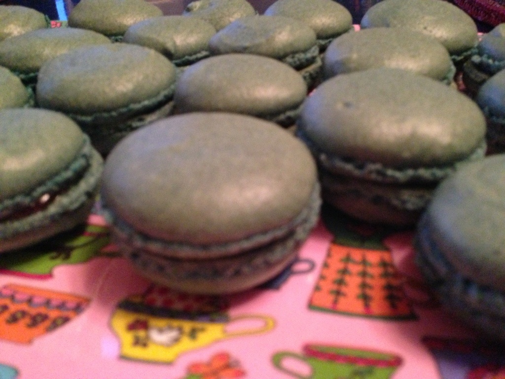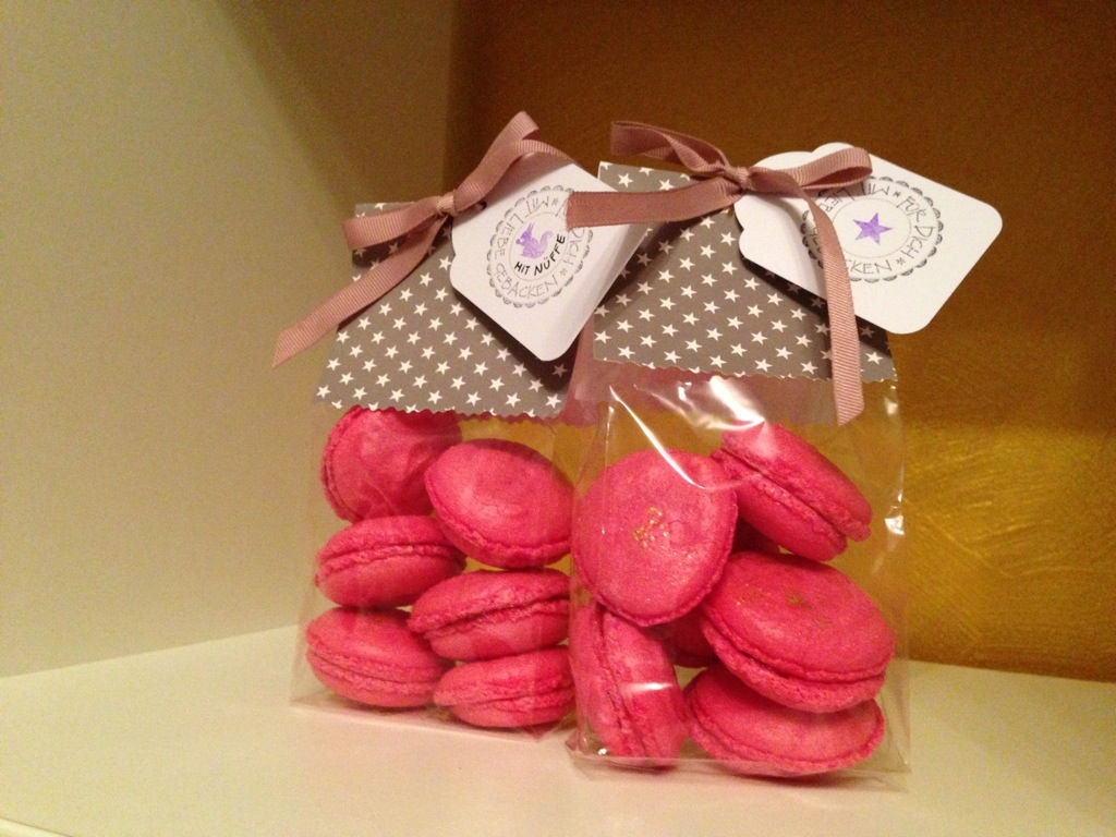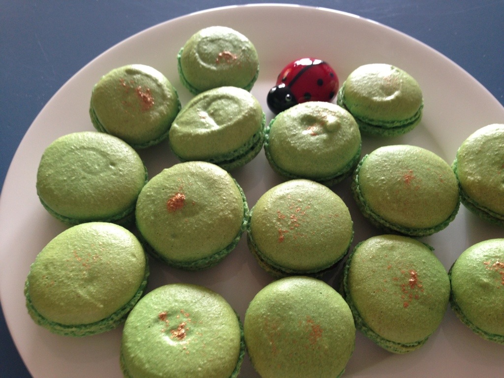 Fertige Masse in einen Spritzbeutel geben und runde flache Patzer auf ein Bleck mit Backpapier spritzen. Danach die überschüssige Luft herausklopfen, indem man auf die Unterseite des Blechs schlägt. Wenn man möchte, kannman nun den Goldstaub auf die Macarons bringen. Das geht ganz gut mit einem Wattestäbchen. Einfach locker raufpudern. Nun die Macarons max. 20 Minuten trocknen lassen (es bildet sich eine Haut) und anschließend ca. 12-14 Minuten bei 140 Grad Celsius backen. Macarons auskühlen lassen.