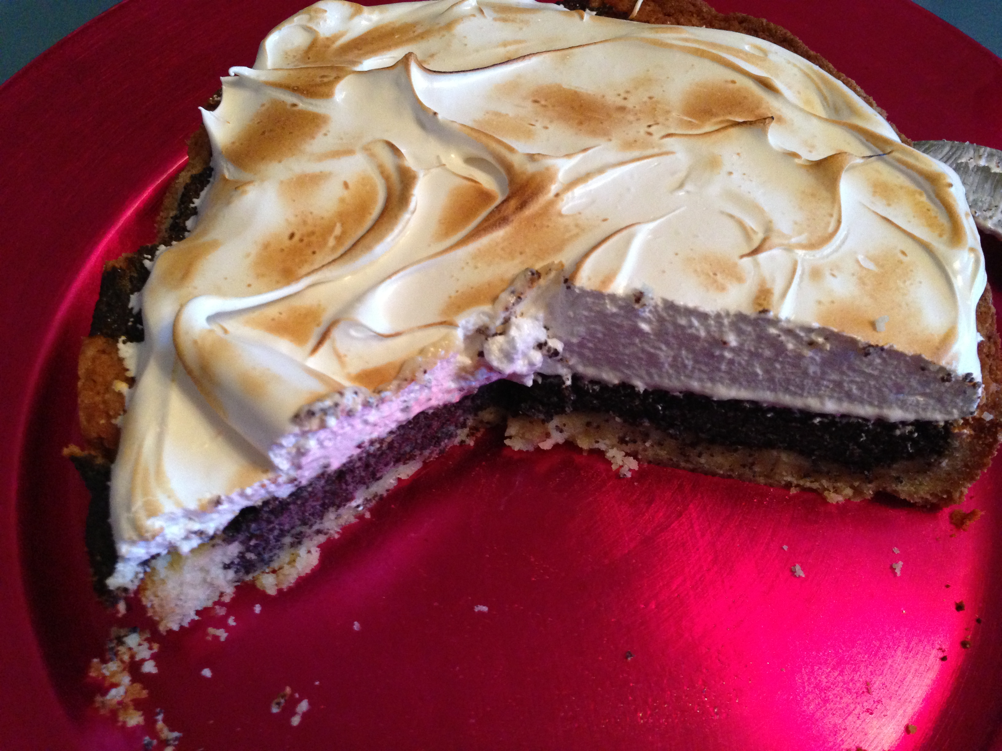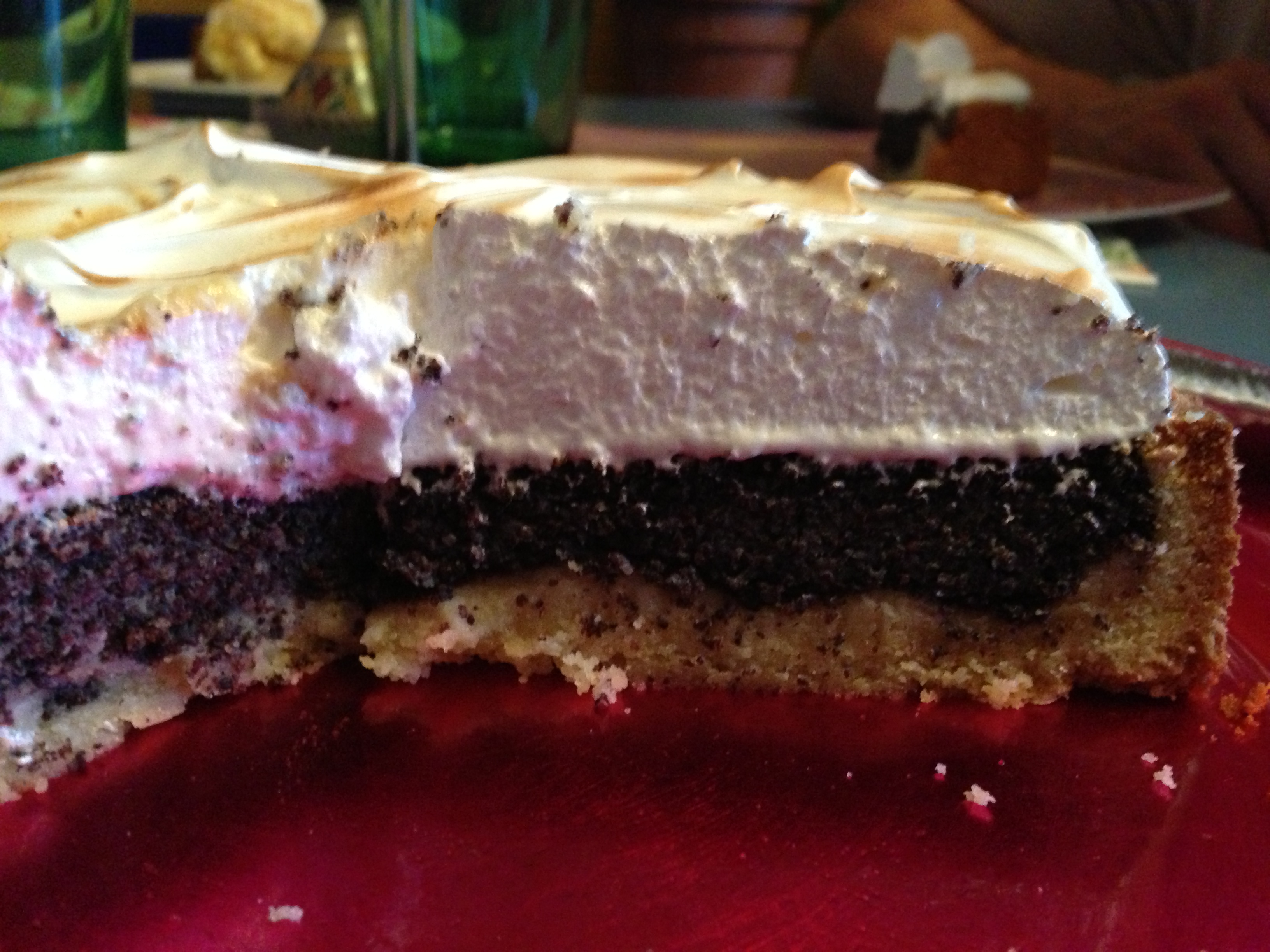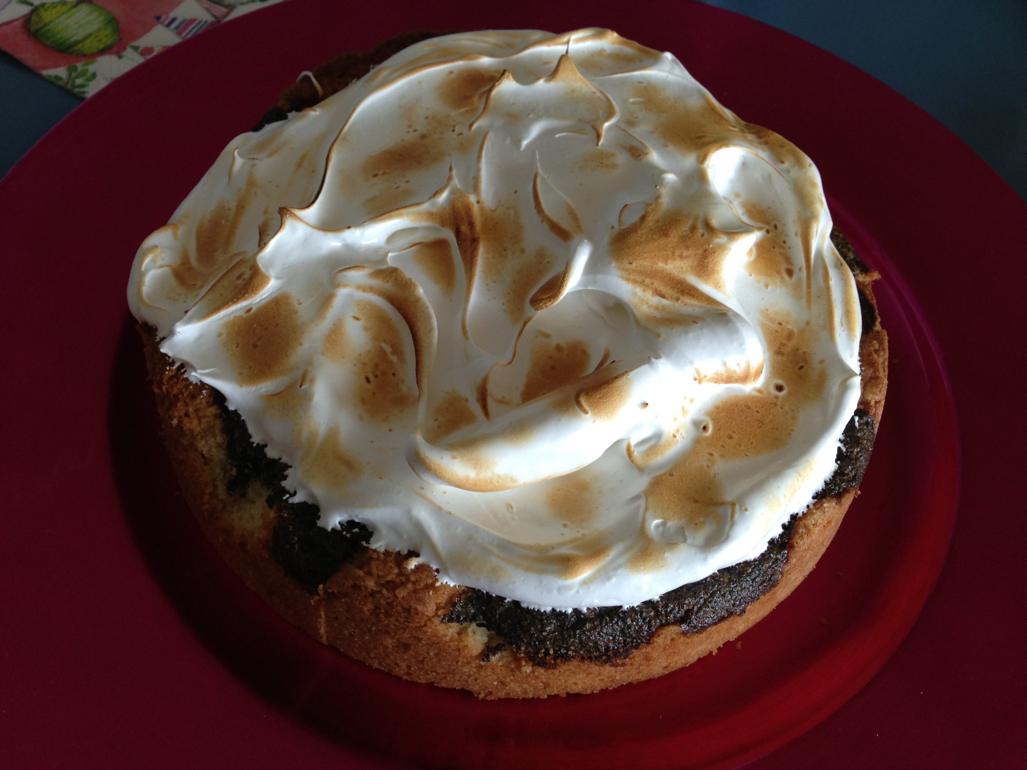 Für den Baiser Eiweiß und Puderzucker mit dem Mixer zuerst bei niedriger Stufe glatt rühren und dann bei höchster Stufe ca. 10 MInuten zu einer glänzenden, festen Schneemasse schlagen. Mohntorte aus der Form lösen und auf eine Tortenplatte geben. Eischnee locker auf der Torte verteilen. Mit einem Küchengasbrenner abflämmen.