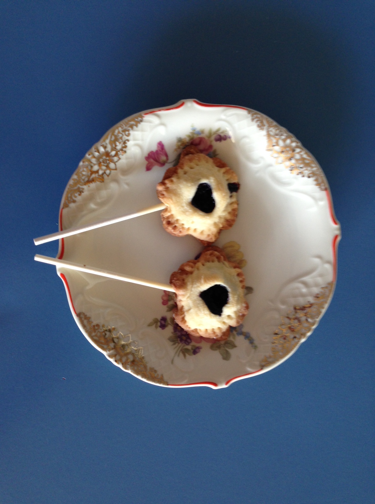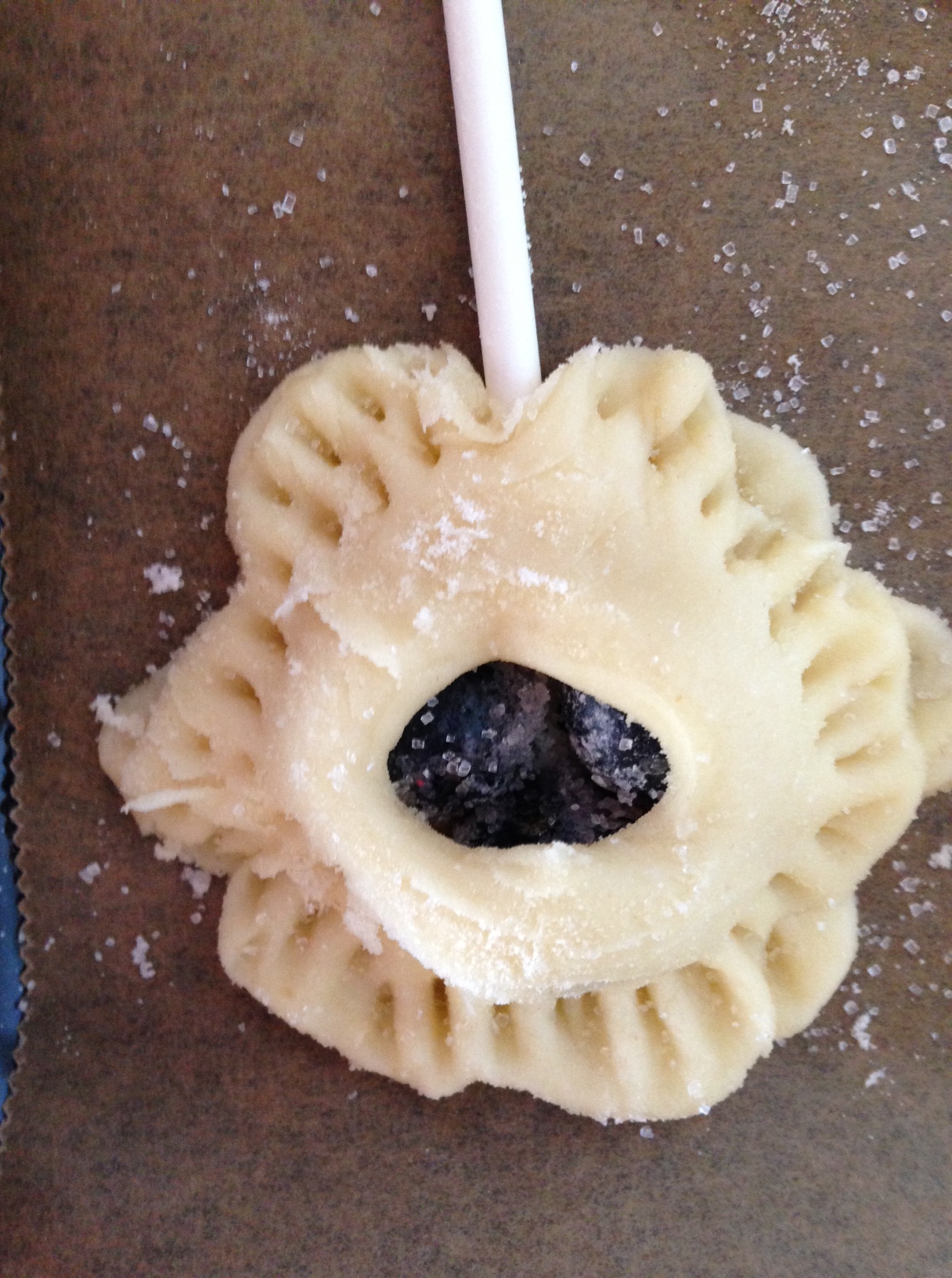 Für die Fülle alle Zutaten gut vermengen. Backrohr auf 190°C Ober- und Unterhitze vorheizen. Teig ca. 3mm dick ausrollen und mit dem gewünschten Keksausstecher den Teig ausstechen. Die ausgestochenen Teigformen auf das mit Backpapier ausgelegte Backblech legen. Es sollte genügend Platz dazwischen sein, sodass man nun in jede Teigform einen Lollipop-Stick reinstecken kann. Fest andrücken. Nun die Füllung auf den Teig geben – ca. 3-5 gezuckerte Heidelbeeren, je nach Teigformgröße. Nun das Oberteil ausstechen. Wenn man keinen Loch- oder Herzausstecher für die Mitte hat, einfach mit dem scharfen Messer ein paar dünne Schnitte reinmachen. Nun auf das bereits gefüllte Teigunterteil drauflegen und die Enden mit einer Gabel andrücken. Nun noch etwas Feinkristallzucker drüberstreuen und ab damit in den Backofen. Dort sollen die Keks-Lollies für circa 15-20 Minuten bleiben. Fertig gebackene Kekse auskühlen lassen und nun vom Backblech/Backpapier lösen.