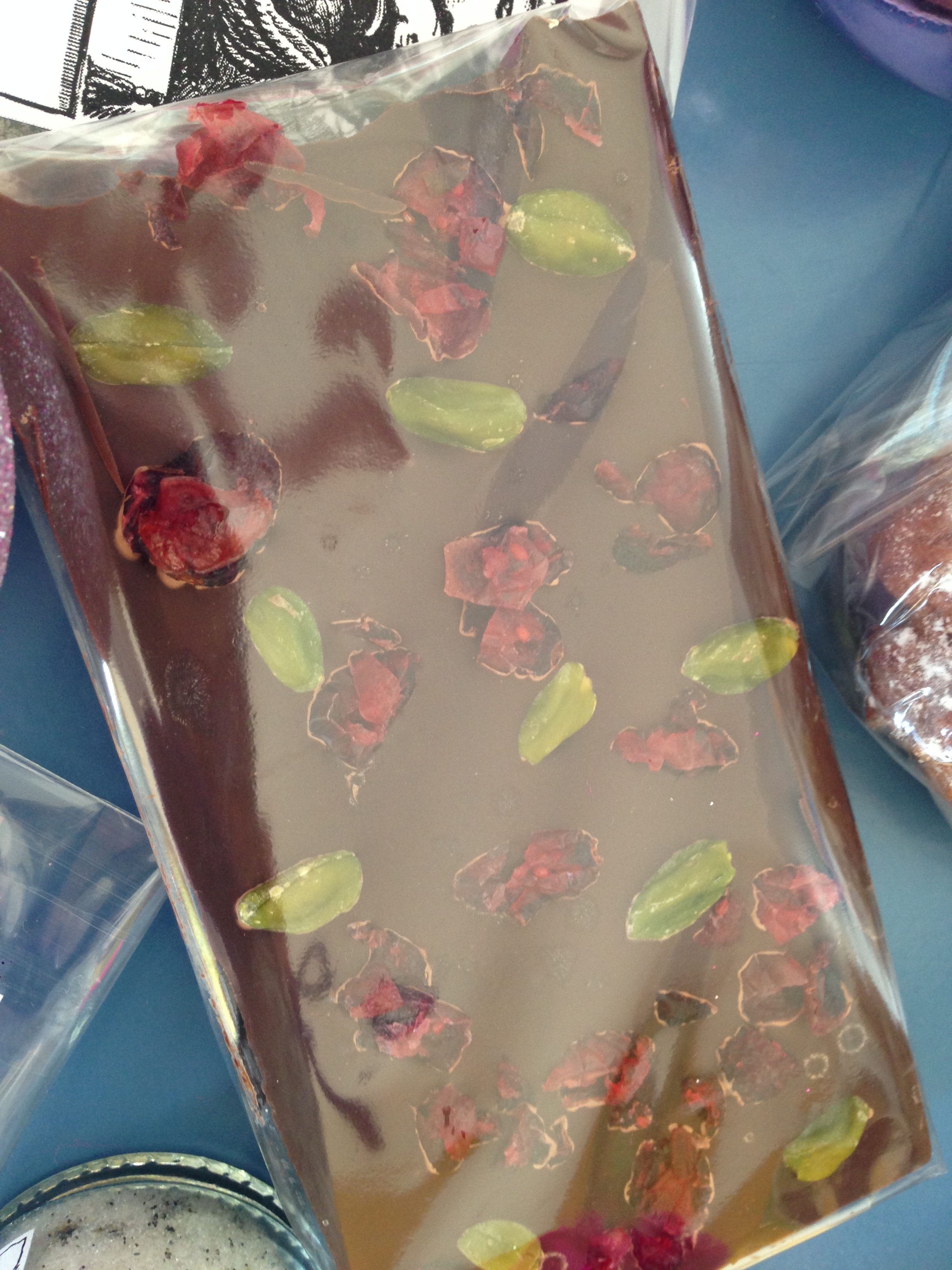Es gab eine dunkle Schokolade mit Tonkabohne, Cranberries und Pistazien.