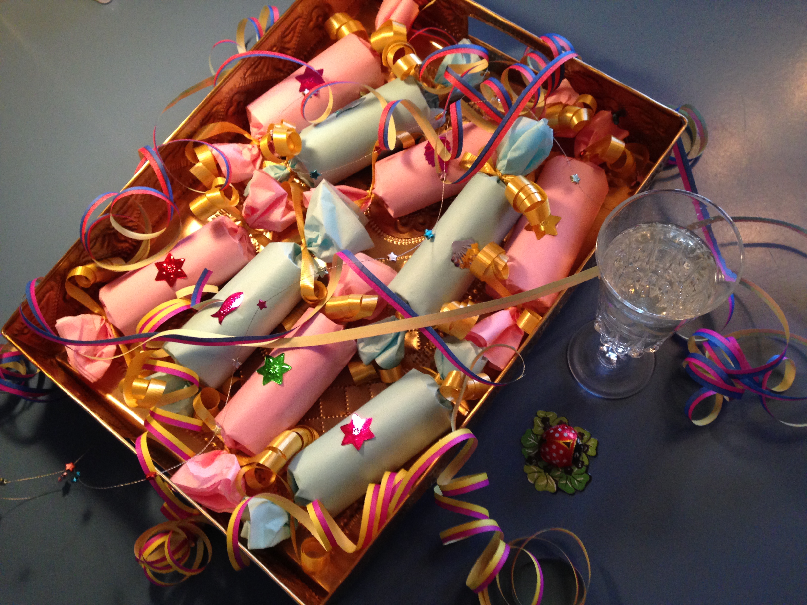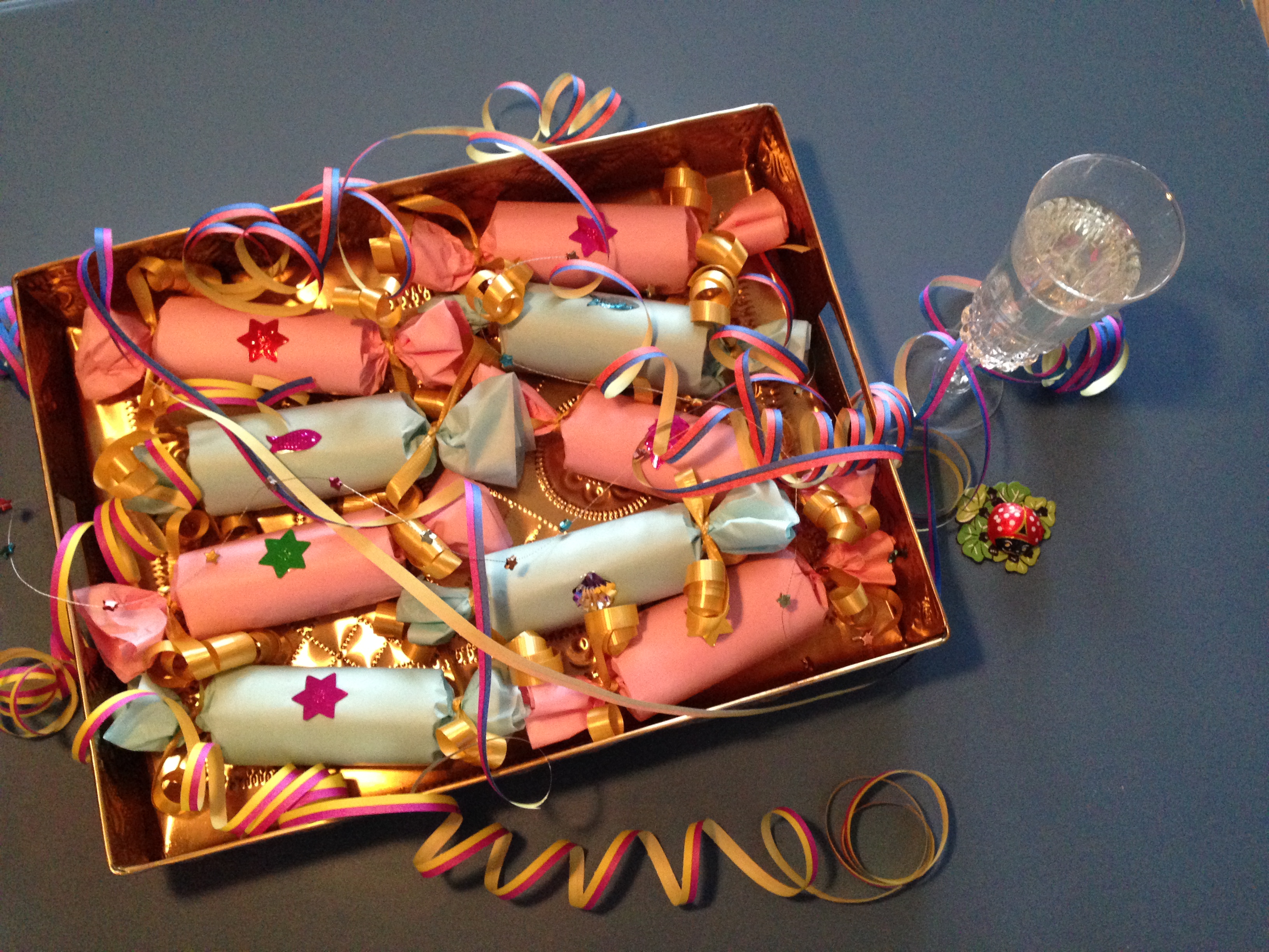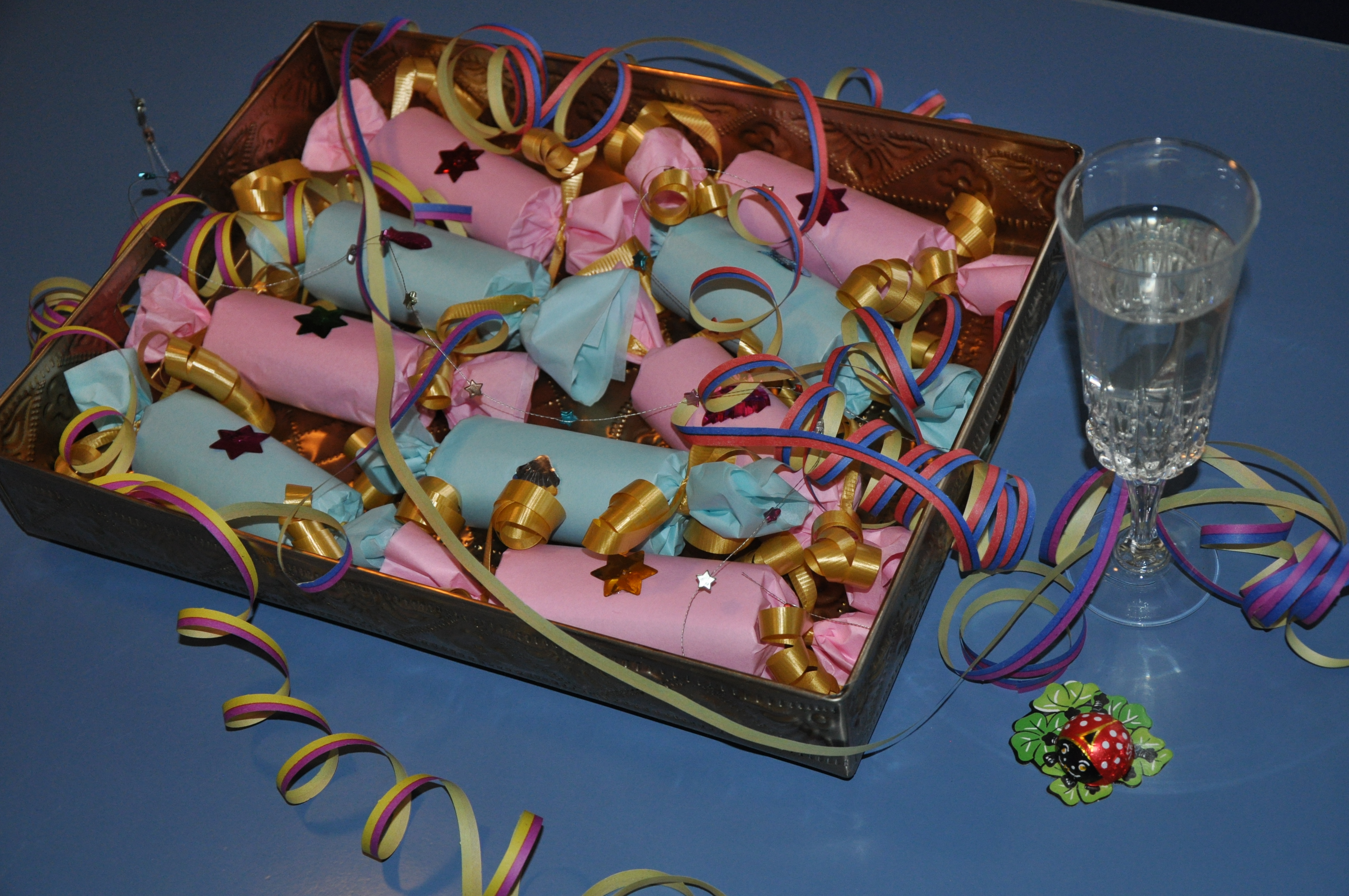 Die Cracker werden dann um Mitternacht verteilt. Zum Öffnen der Cracker an beiden Seiten gleichzeitig anreißen, so dass die Pailetten schön bunt durch den Raum fliegen.