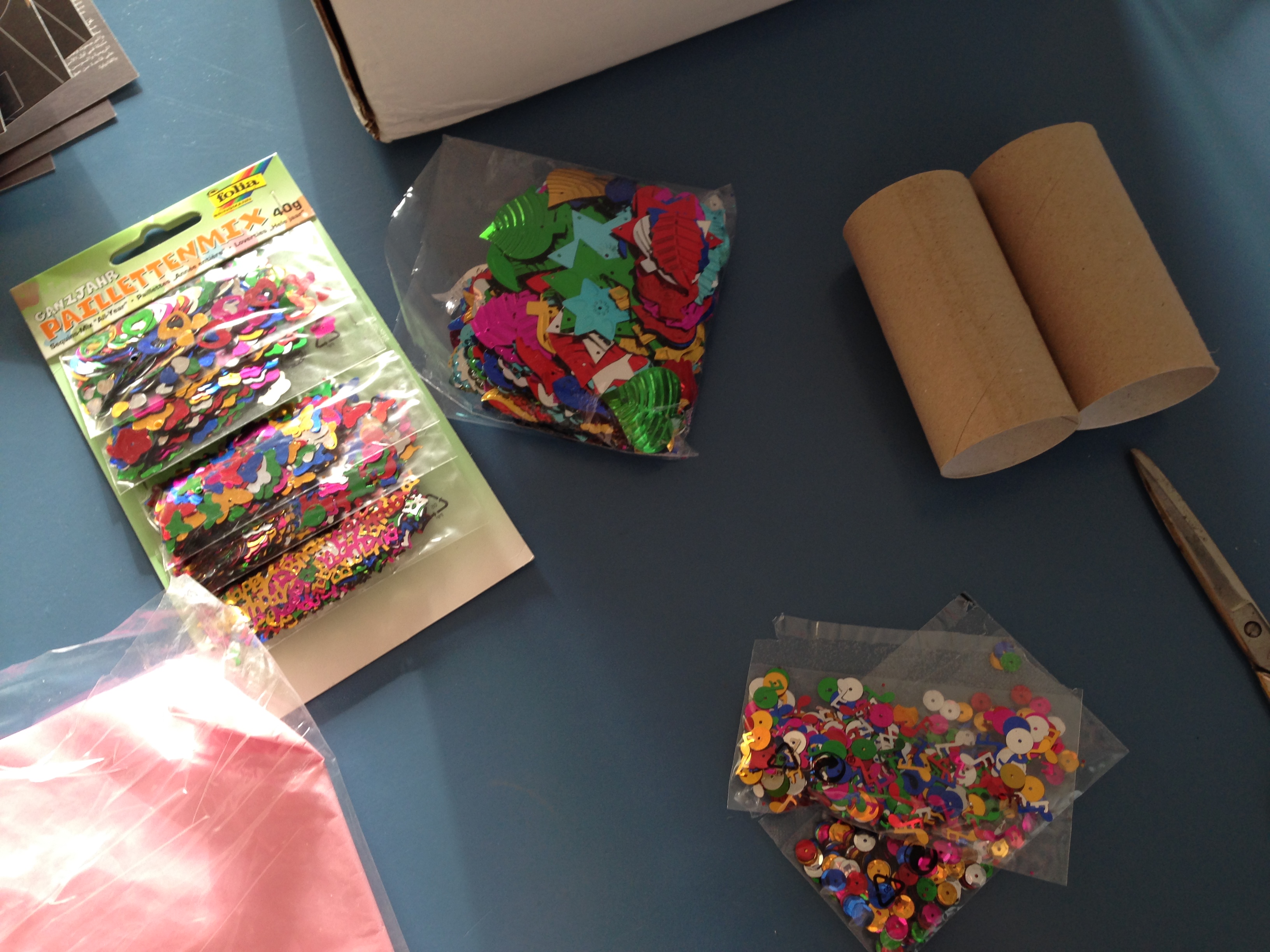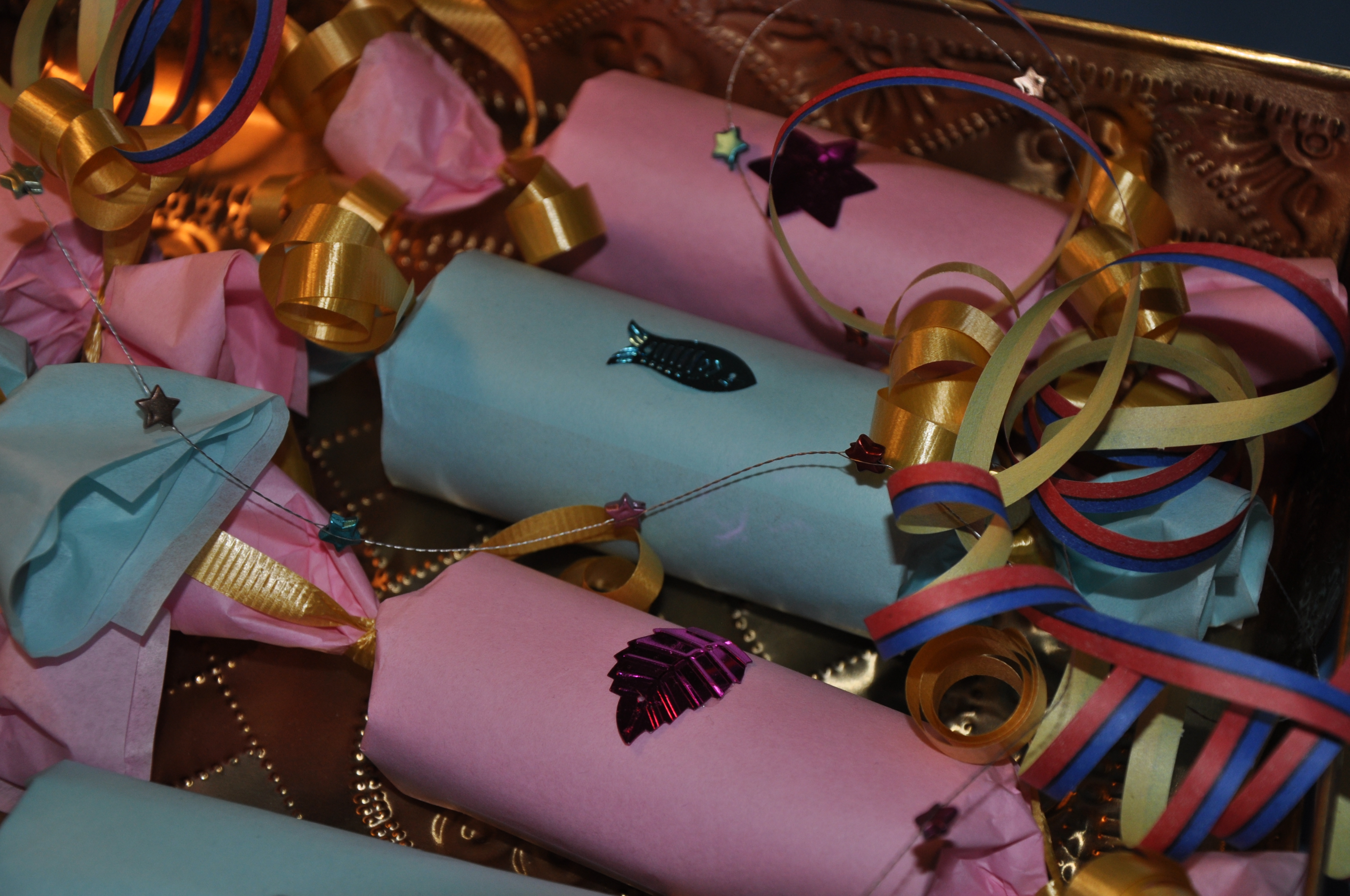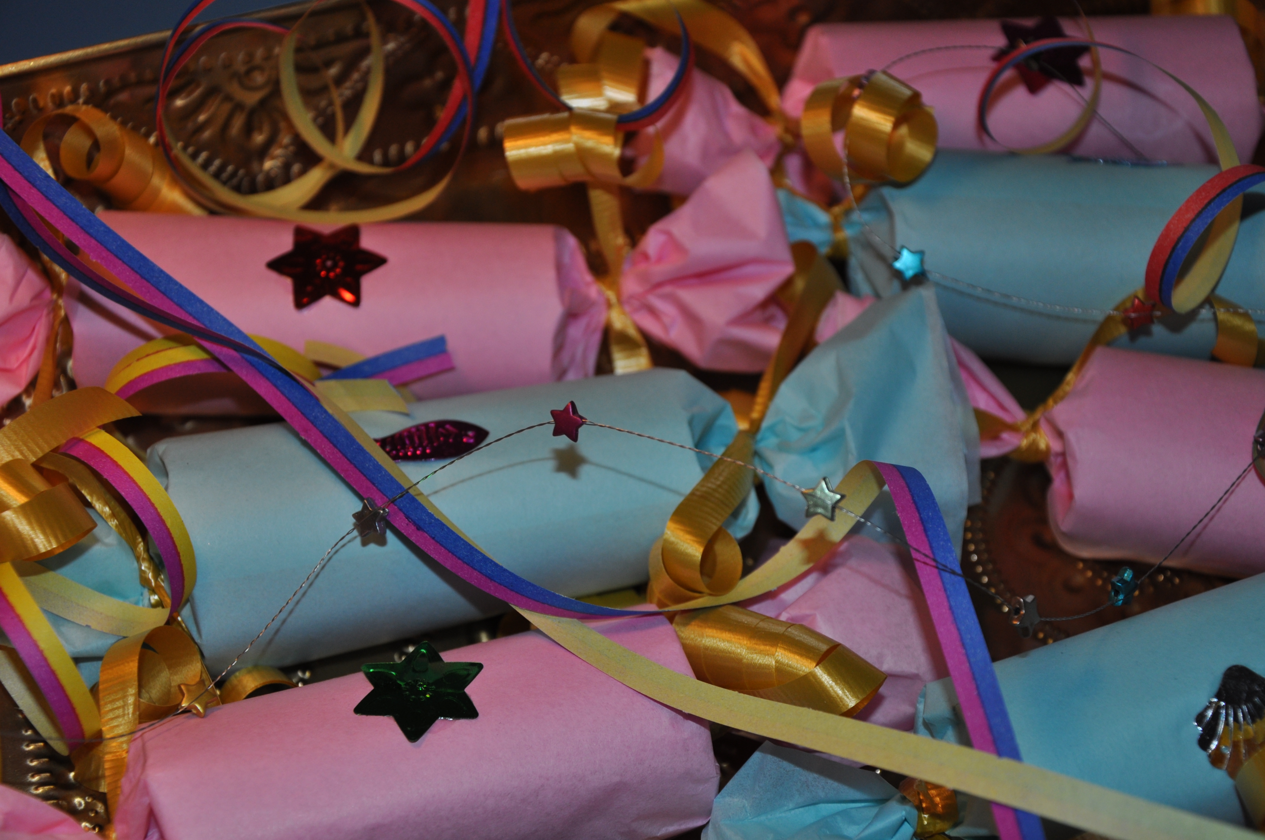 Die Cracker werden dann um Mitternacht verteilt. Zum Öffnen der Cracker an beiden Seiten gleichzeitig anreißen, so dass die Pailetten schön bunt durch den Raum fliegen.