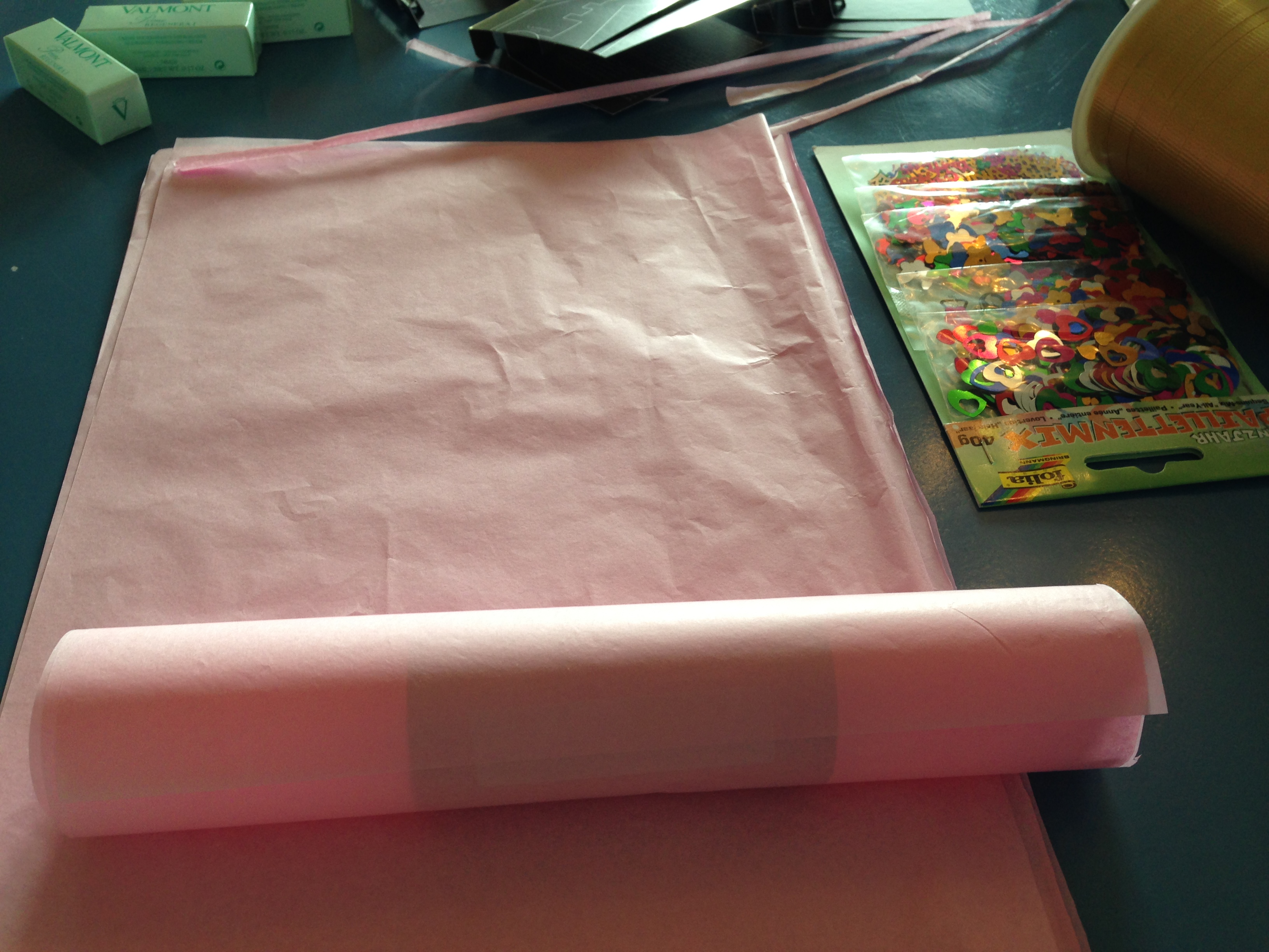 Seidenpapier, Tixo, Schere, Kleber und Geschenksbänder.