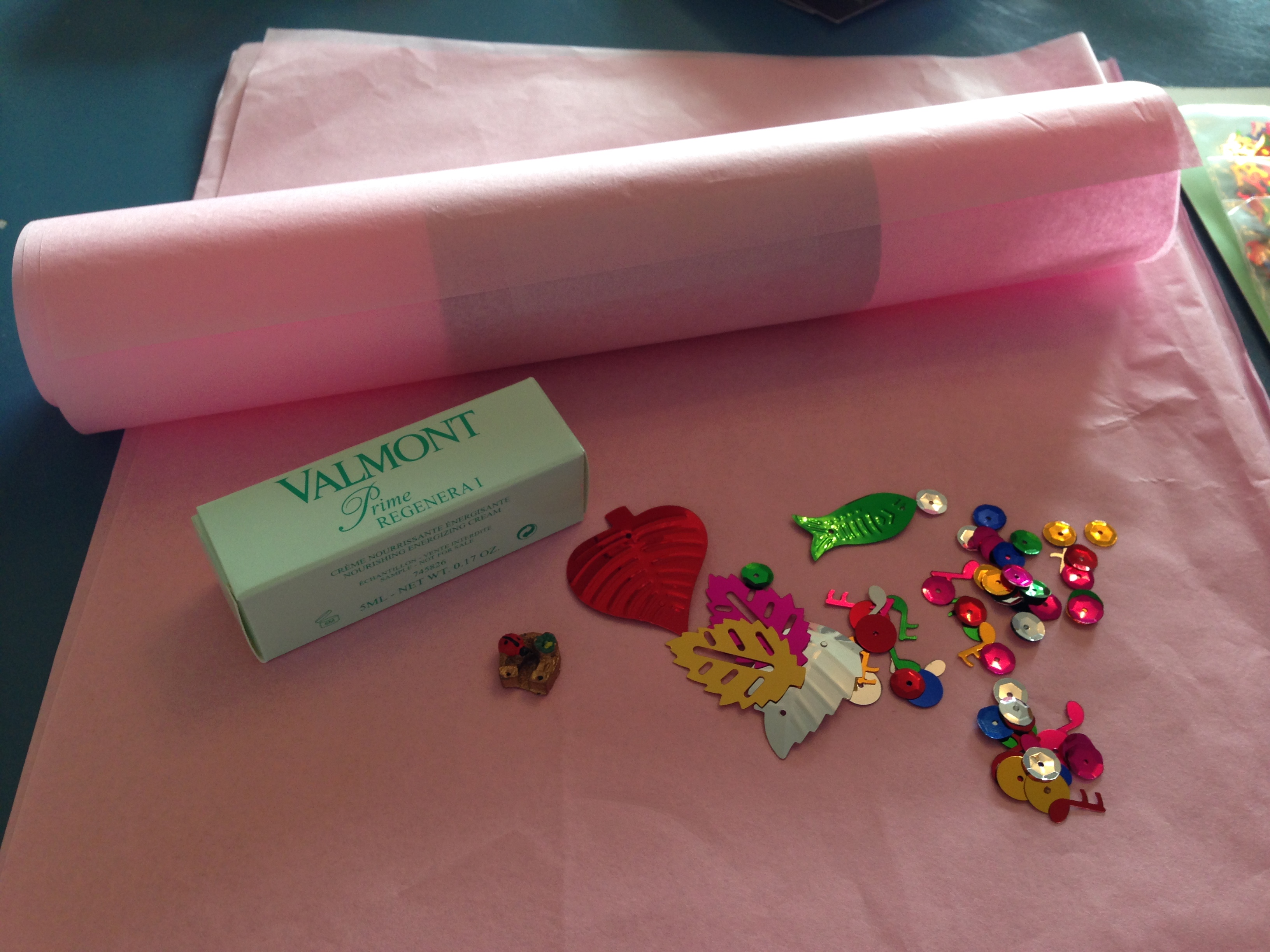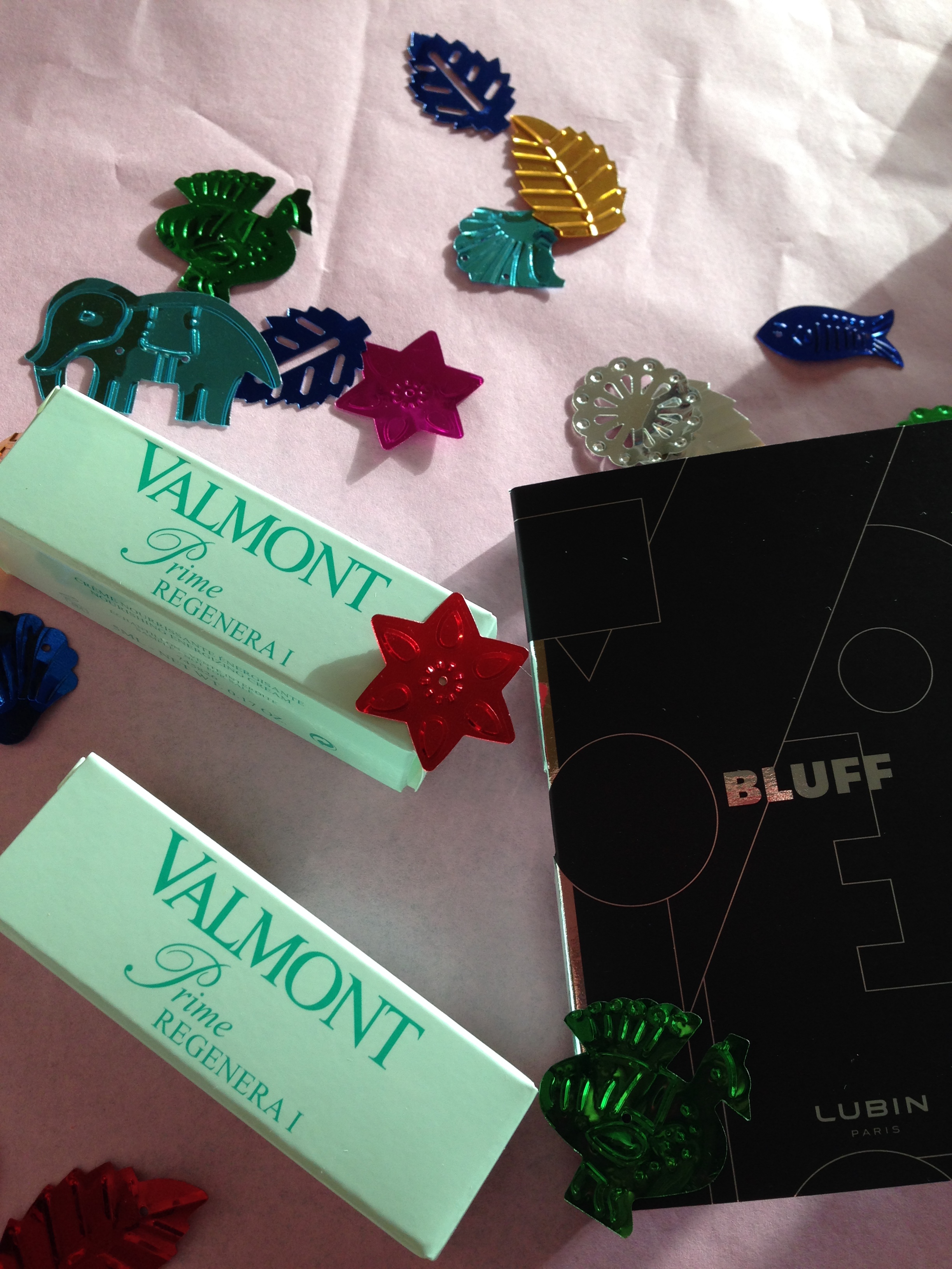 Außerdem Pailletten und Glücksbringer und bei mir gibt’s eben noch eine Creme von Valmont oder das Parfum von Lubin.