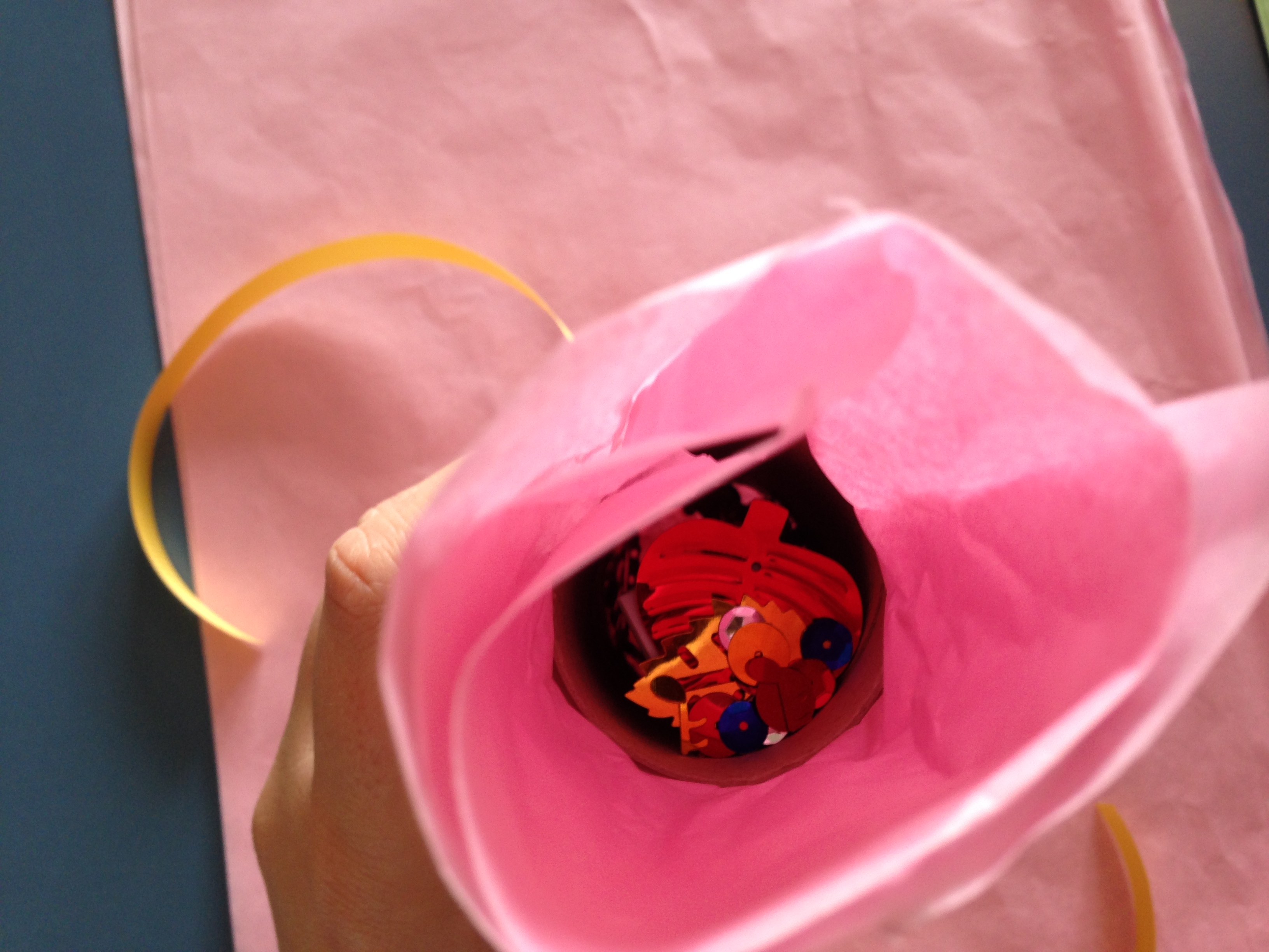 In die noch offene Seite füllt ihr das Streumaterial, den Glücksbringer und die Creme- oder Parfümprobe. Nun könnt ihr auch dieses Seite mit einem Geschenksband schließen. Die Bänder nun noch kringeln und auf die Außenseite eine Paillette mit etwas Kleber befestigen. Fertig ist euer Cracker.
