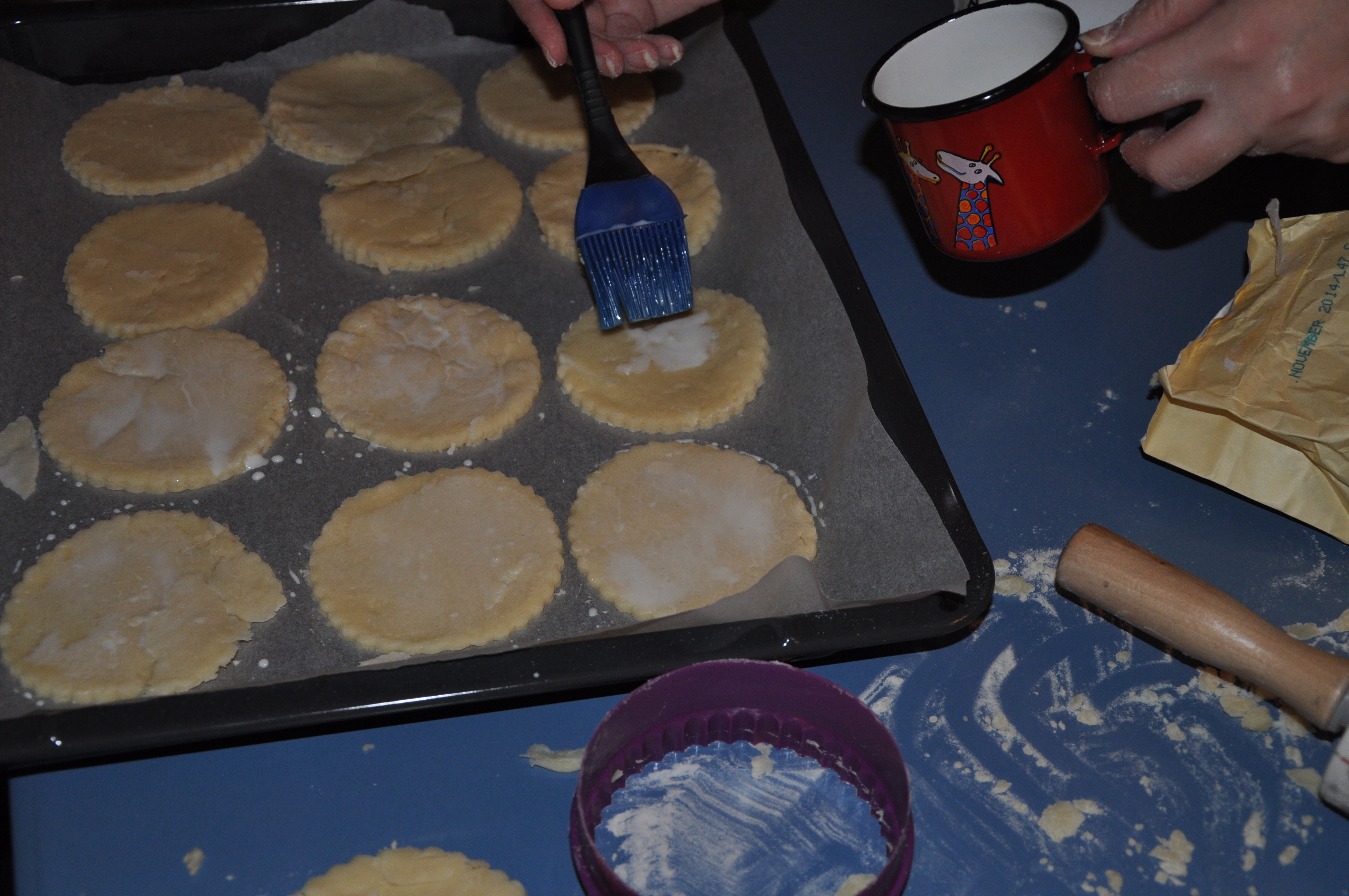 Teig auf einer bemehlten Arbeitsfläche dünn ausrollen und Kreise mit ca. 10 cm ausstechen.
