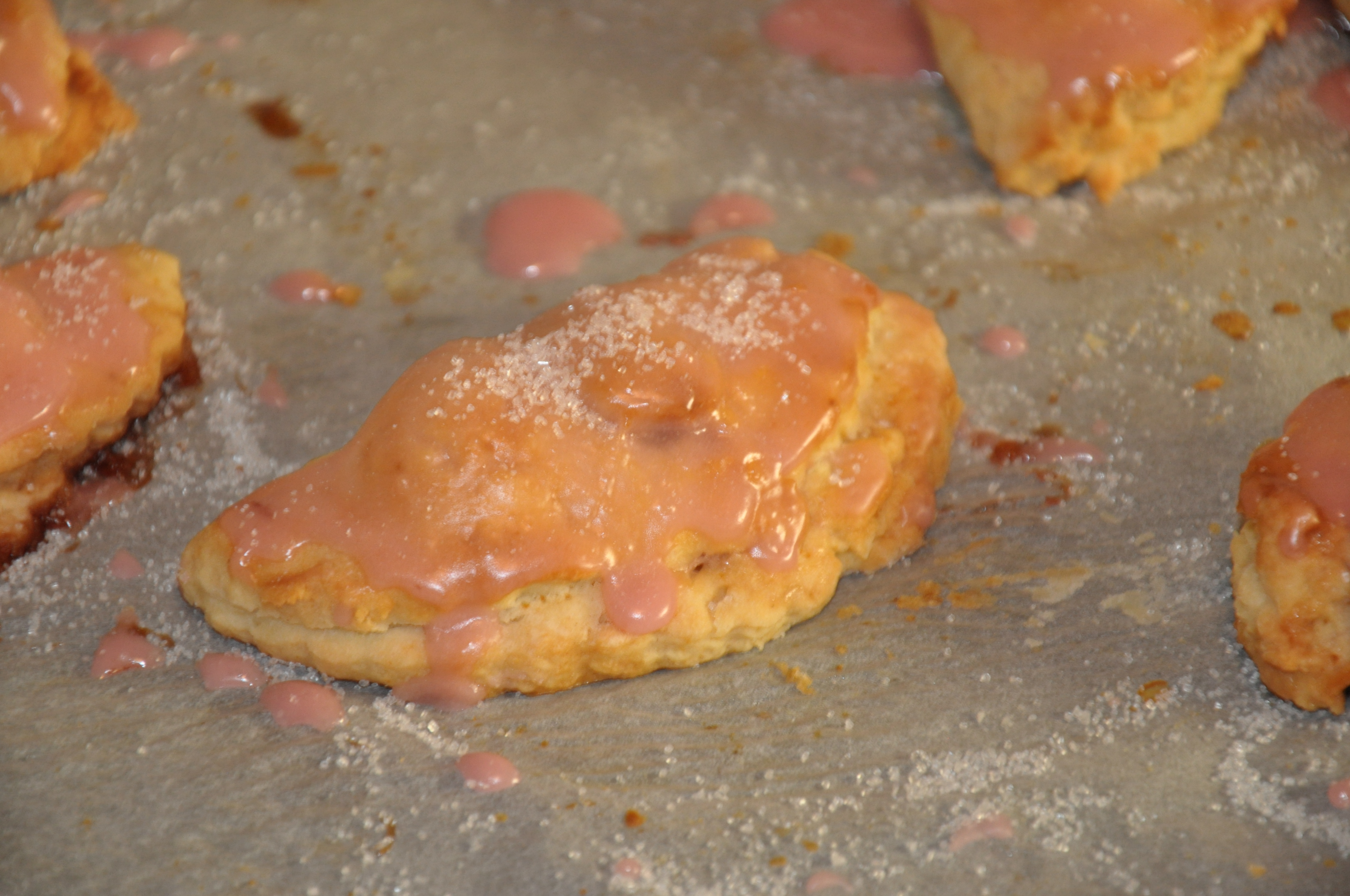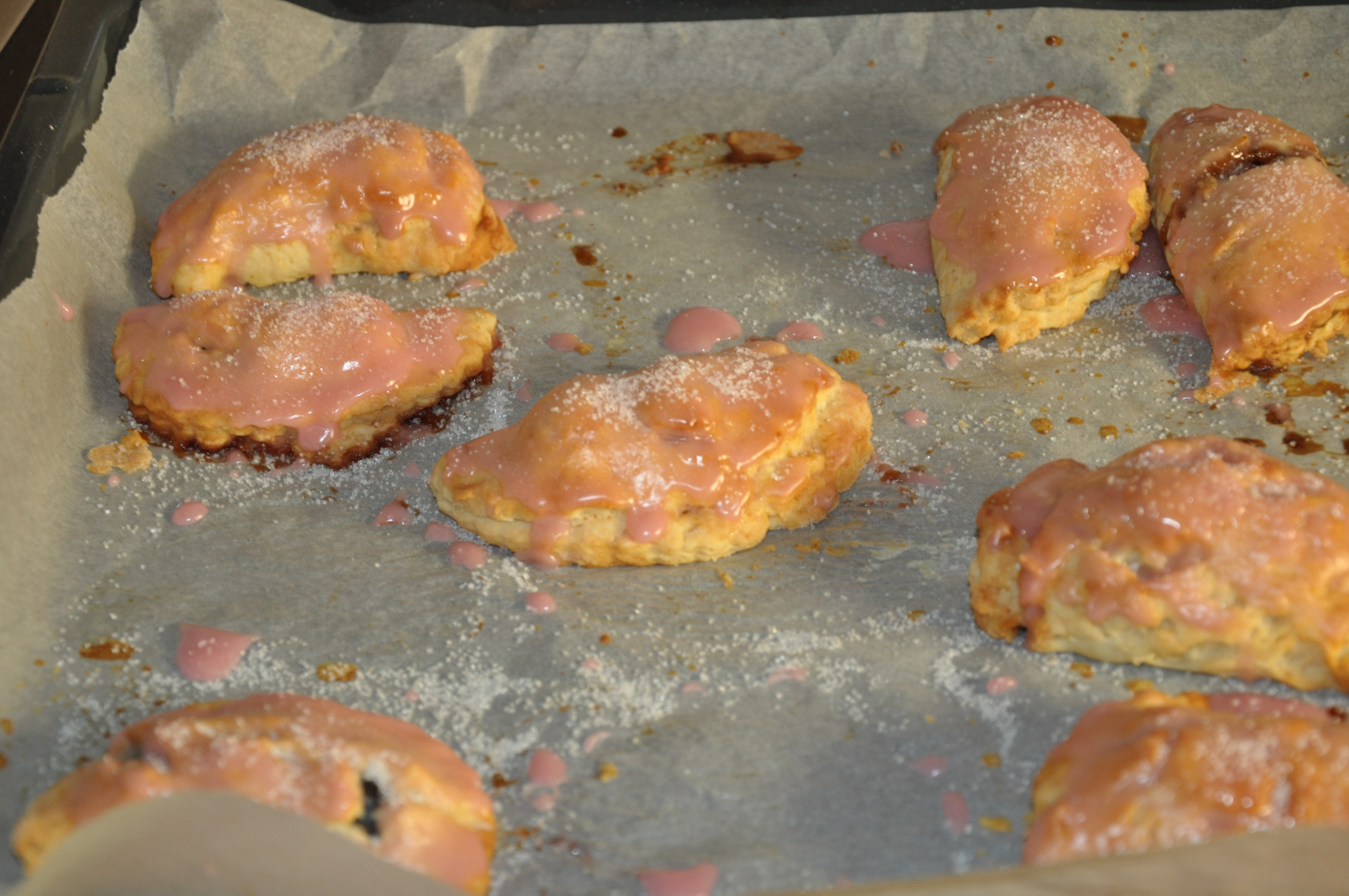 Für den Guss Staubzucker, Kirschsirup und Wasser zu einem glatten Guss rühren. Kirschtaschen aus dem Ofen nehmen und mit dem rosaroten Zuckerguss mit einem Pinsel bestreichen. Danach noch etwas Kristallzucker darüber streuen.