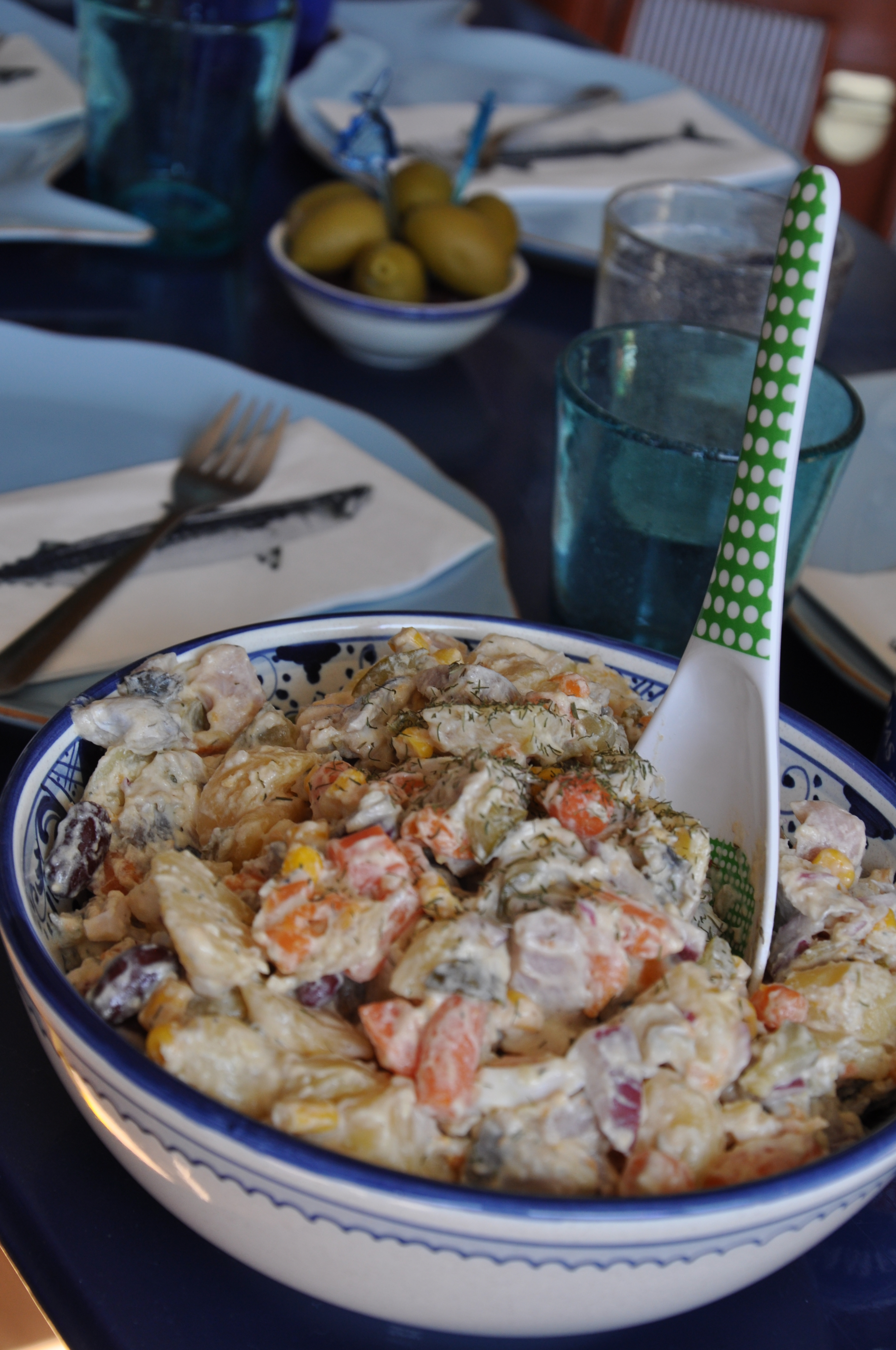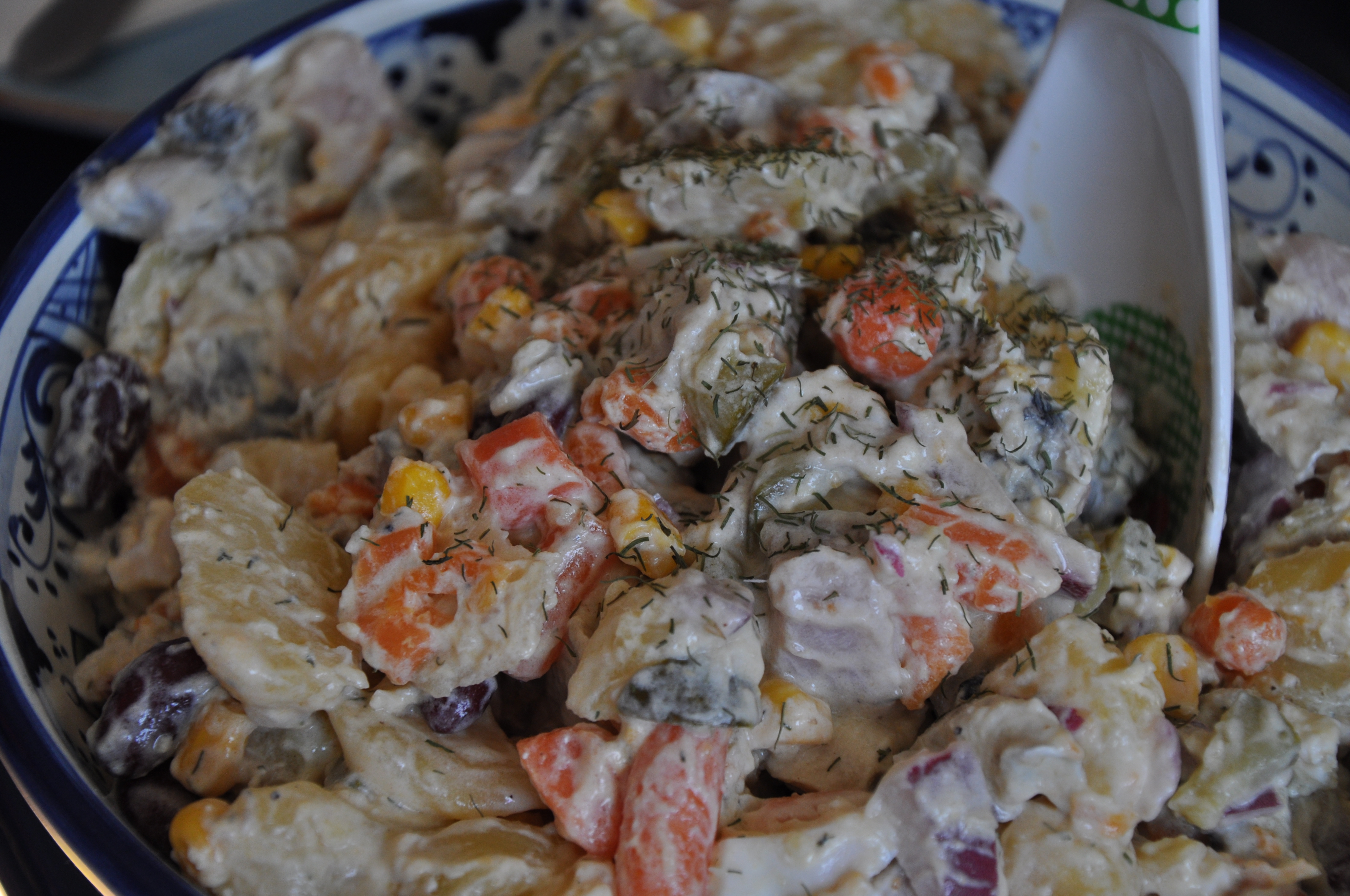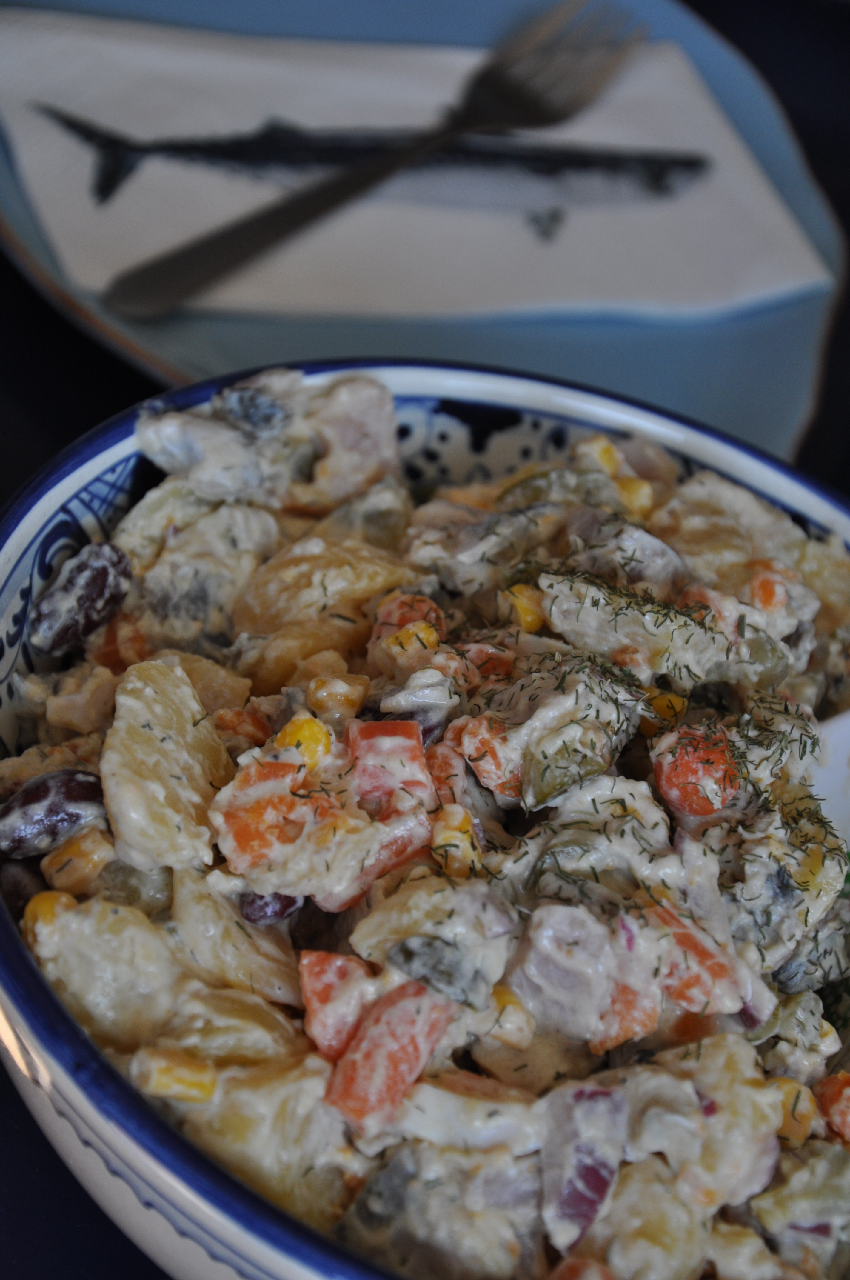 Alle Zutaten klein schneiden und in einer großen Schüssel mit Mayonnaise, Sauerrahm, Dill, Senf und Pfeffer abschmecken. Ein paar Stunden im Kühlschrank ziehen lassen. Dazu passt prima eine Semmel und ein Krügerl Bier oder ein Glaserl Wein.