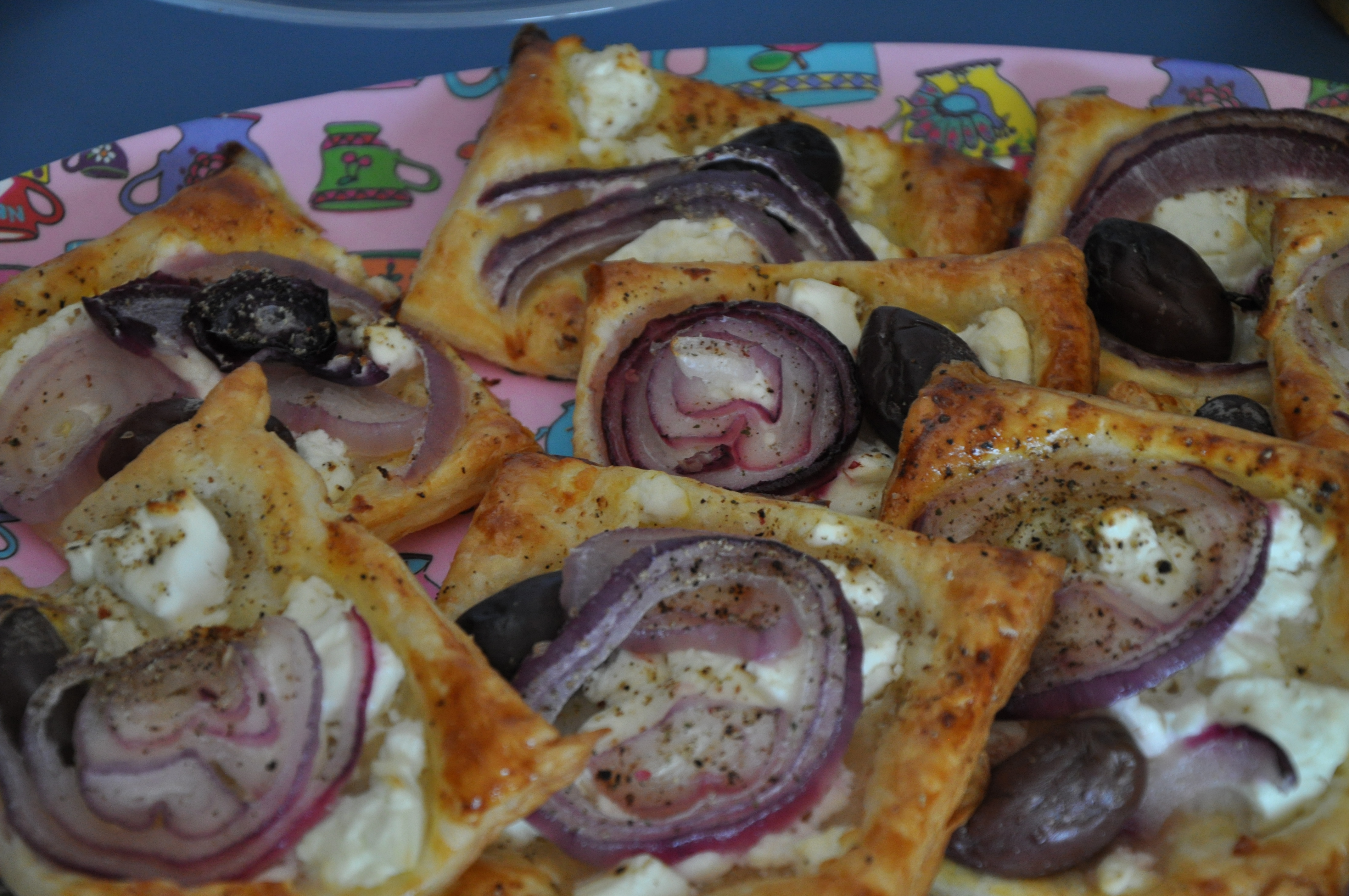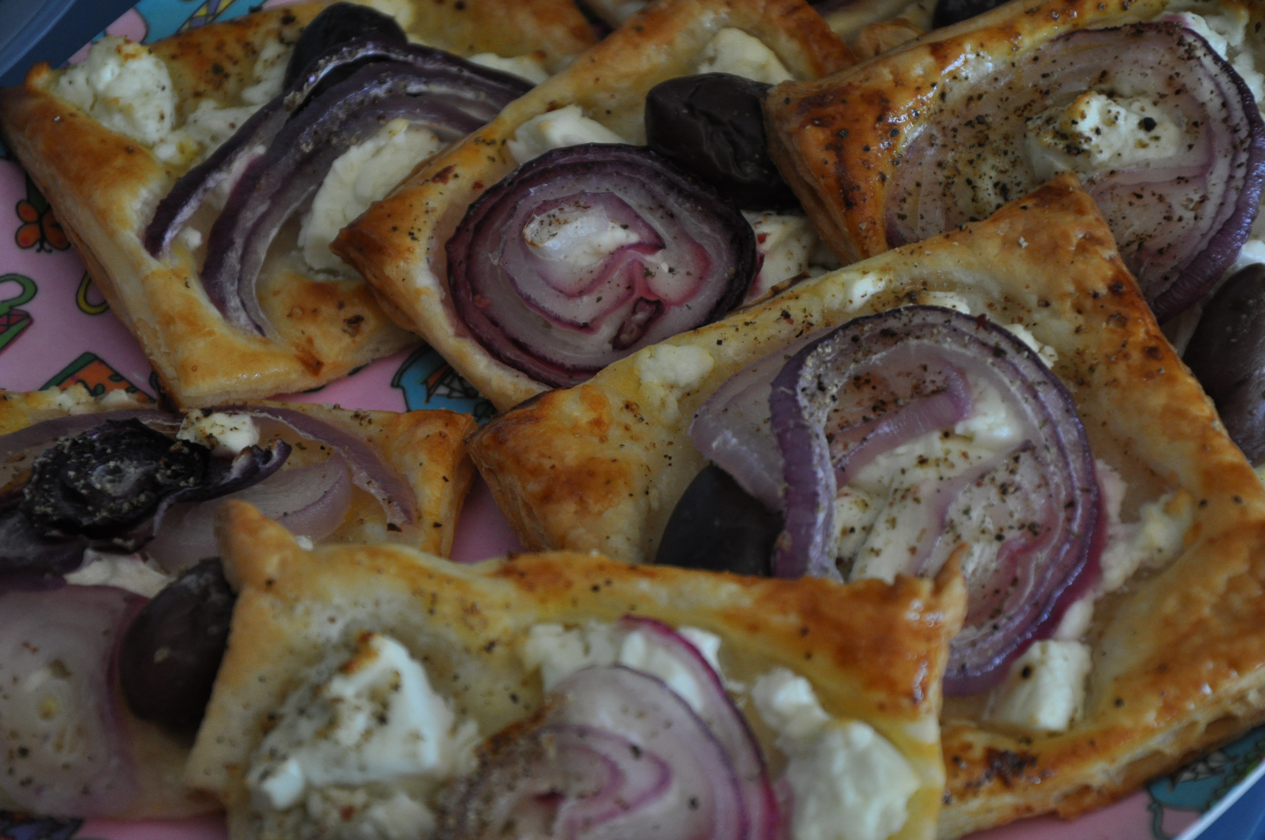 Blätterteig am Backblech auf einem Backpapier ausrollen und in 15 Rechtecke schneiden. Die Rechtecke am Blech verteilen, sodass sie nicht zusammenpicken. Nun den Blätterteig mit dem verquirlten Ei bestreichen und den Fetakäse auf allen Rechtecken gleichmäßig verteilen. Auf jedes Rechteck setzt ihr eine Olive. Den Zwiebel in Ringe schneiden und auf gleichmäßig auf die Feta-Tartlettes aufteilen. Nun noch etwas Pfeffer drüber. Und ab ins vorgeheizte Backrohr (Ober- und Unterhitze, 180°C). Für ca. 20 Minuten, bis alles goldbraun ist.