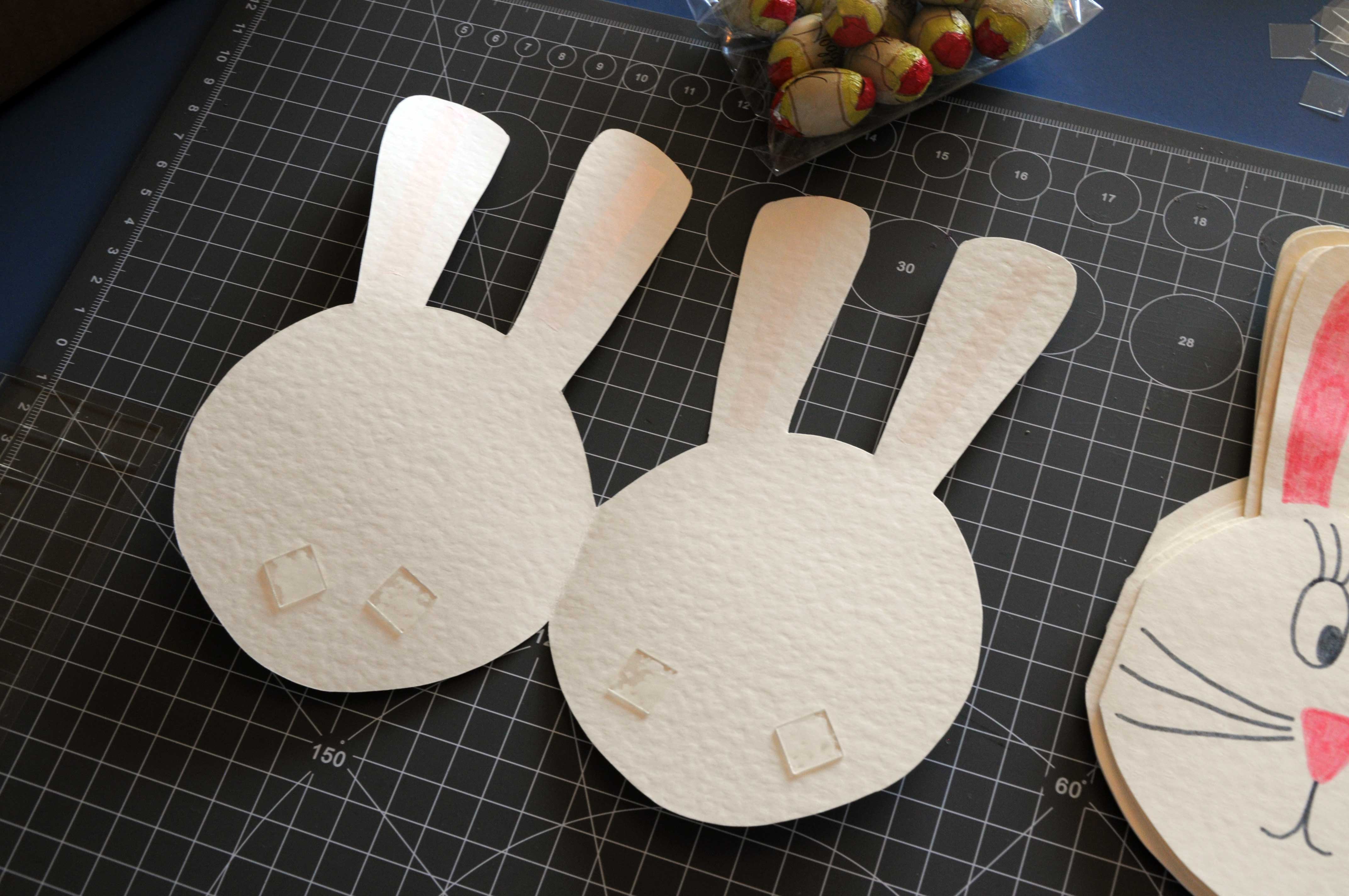 Nun beide Innenseiten des Hasenkopfes mit doppelseitigem Klebeband an der unteren Seite bekleben.