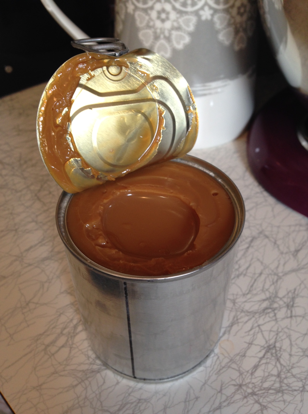 Dulce de Leche, ja was ist das eigentlich? Schon oft gelesen, aber noch nie gemacht. Endlich habe ich eine Dose gezuckerte Kondensmilch bekommen und konnte das Experiment beginnen. Die Dose vom Papieretikett befreien und in einem Topf mit köchelndem Wasser stellen. Das Wasser muss die Dose während der gesamten Kochzeit vollständig bedecken und darf nur sehr leicht köcheln. Ab und zu prüfen, ob sich noch genügend Wasser im Topf befindet. Nach 2 1/2 – 3 Stunden ist eine dicke Karamellcreme in der Dose entstanden. Dose aus dem heißen Wasser nehmen und abkühlen lassen. Bis zur weiteren Verarbeitung im Kühlschrank aufbewahren.
