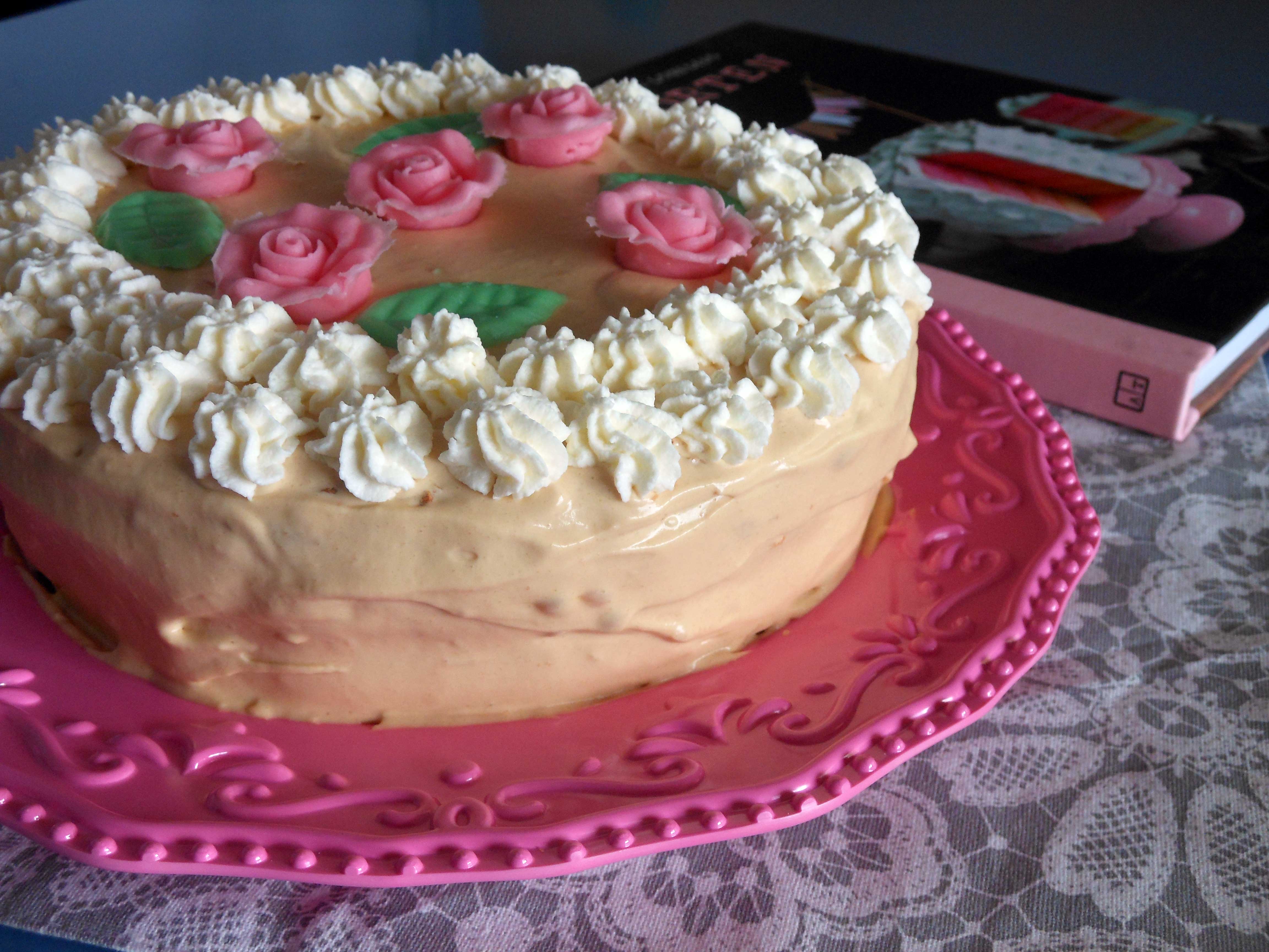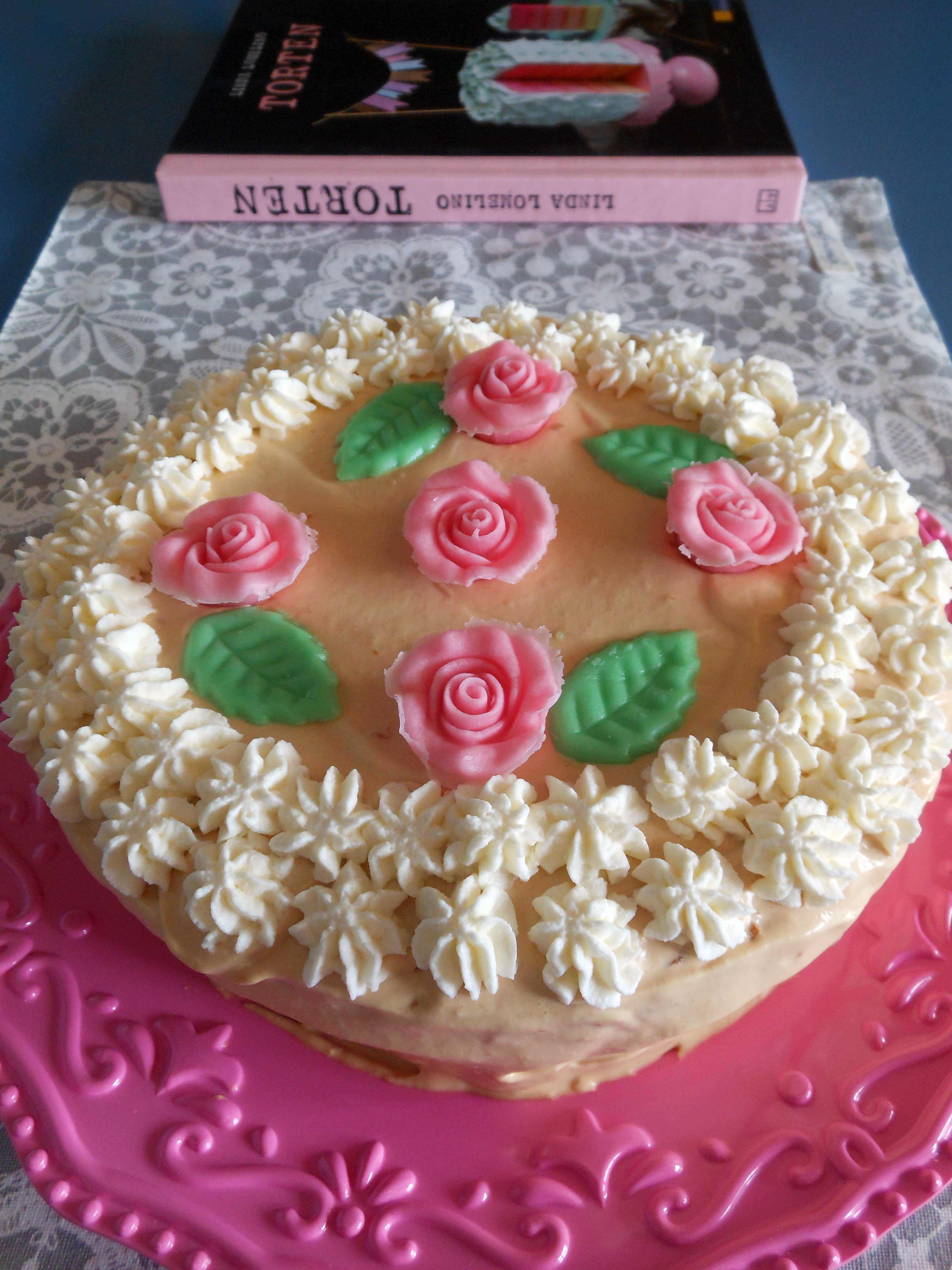 Die beiden Tortenböden horizontal halbieren, um vier dünne Böden zu erhalten. (Das habe ich nicht gemacht, da ich eine 18cm Form nahm und so der Teigboden von Haus aus viel flacher ausgefallen ist). Den ersten Boden auf einem Tortenteller legen und mit einer gleichmäßigen Schicht Dulce-de-Leche-Creme bestreichen. So mit zwei weiteren Böden fortfahren. Dann den vierten Boden mit der Schnittseite nach unten auflegen. Die gesamte Torte mit einer  dünnen Schicht Dulce-de-Leche-Creme überziehen. Den Schlagobers nun steif schlagen und am oberen Rand der Torte ein Muster aufspritzen. Seitlich kann man die Torte noch mit Schokoladenspänen dekorieren. Da meine Torte für meine Mama zum Muttertag war gab’s Marzipan-Rosen, die gibt’s zB bei Dr. Oetker.
