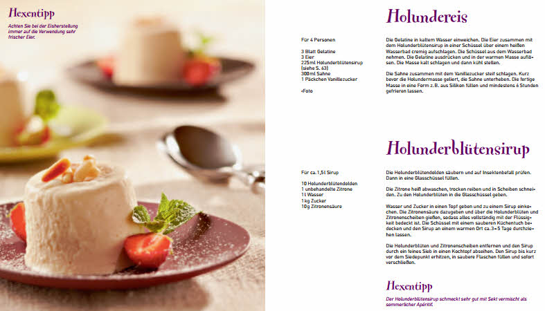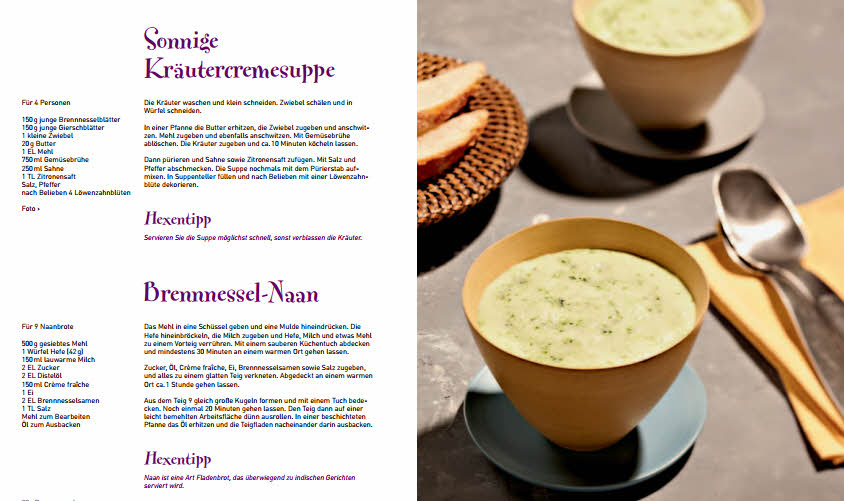 Die Gerichte laden nicht nur zum Nachkochen ein sondern auch zur intensiven Kräutersuche. Raus aufs Feld! Die Rezepte sind relativ einfach und eine Großzahl verfügt auch über Bilder. Man findet hier neben Brennnessel-Naan, Fliederbeersuppe mit Eischneeklößchen auch einen Zitronenmelissen-Tortentraum. Rezepte für die ganze Familie, aber auch für ein ausgefallenes Dinner. Außerdem gibt’s zu jedem Rezept einen kleinen Hexentipp.