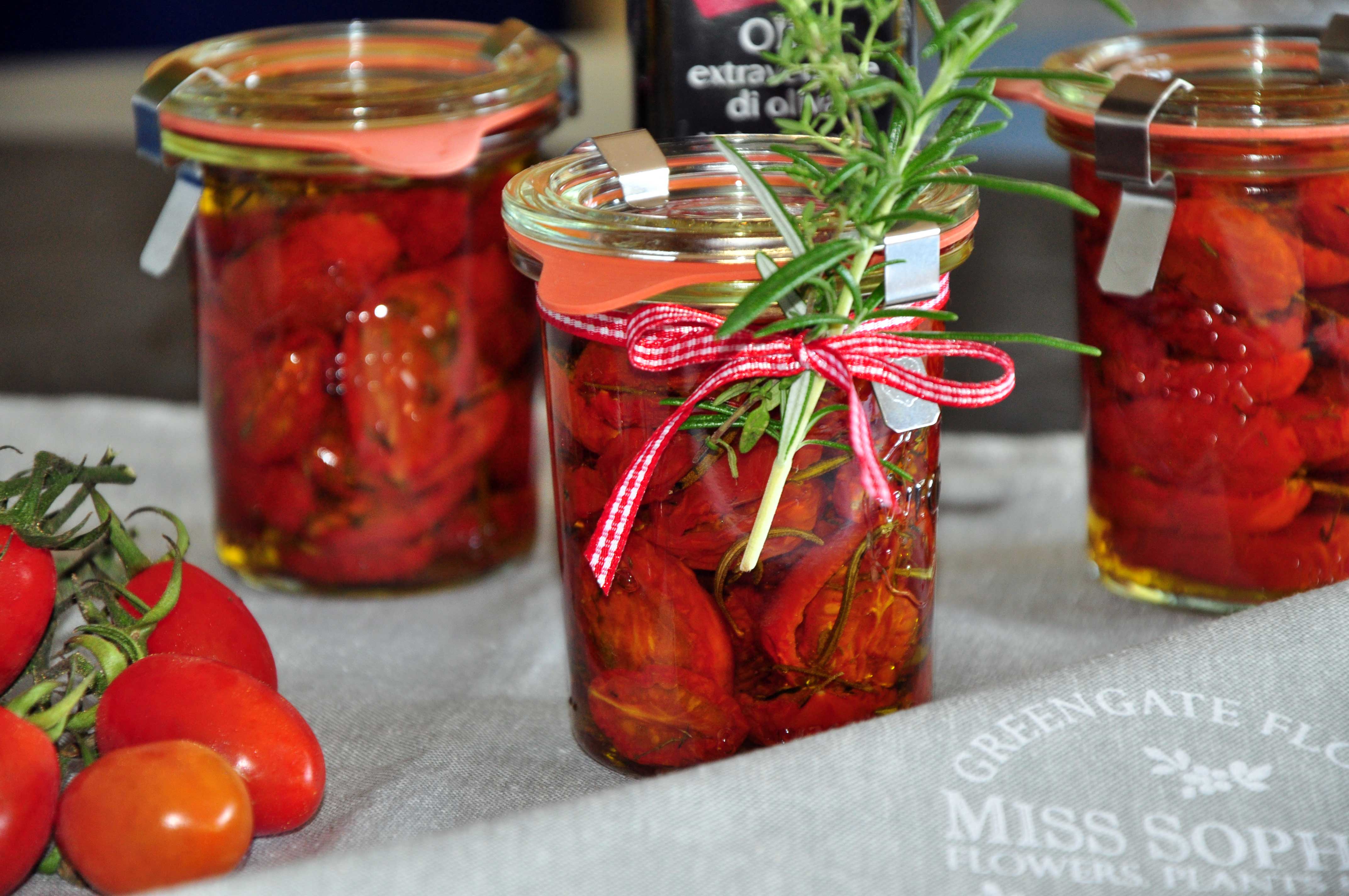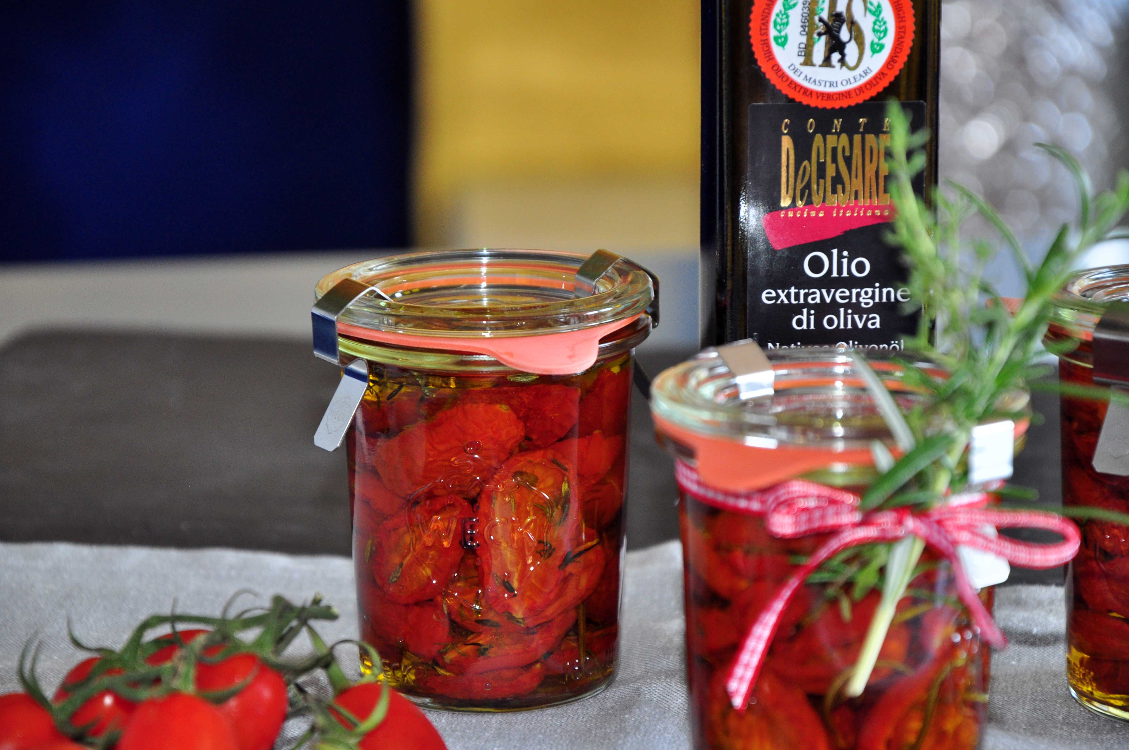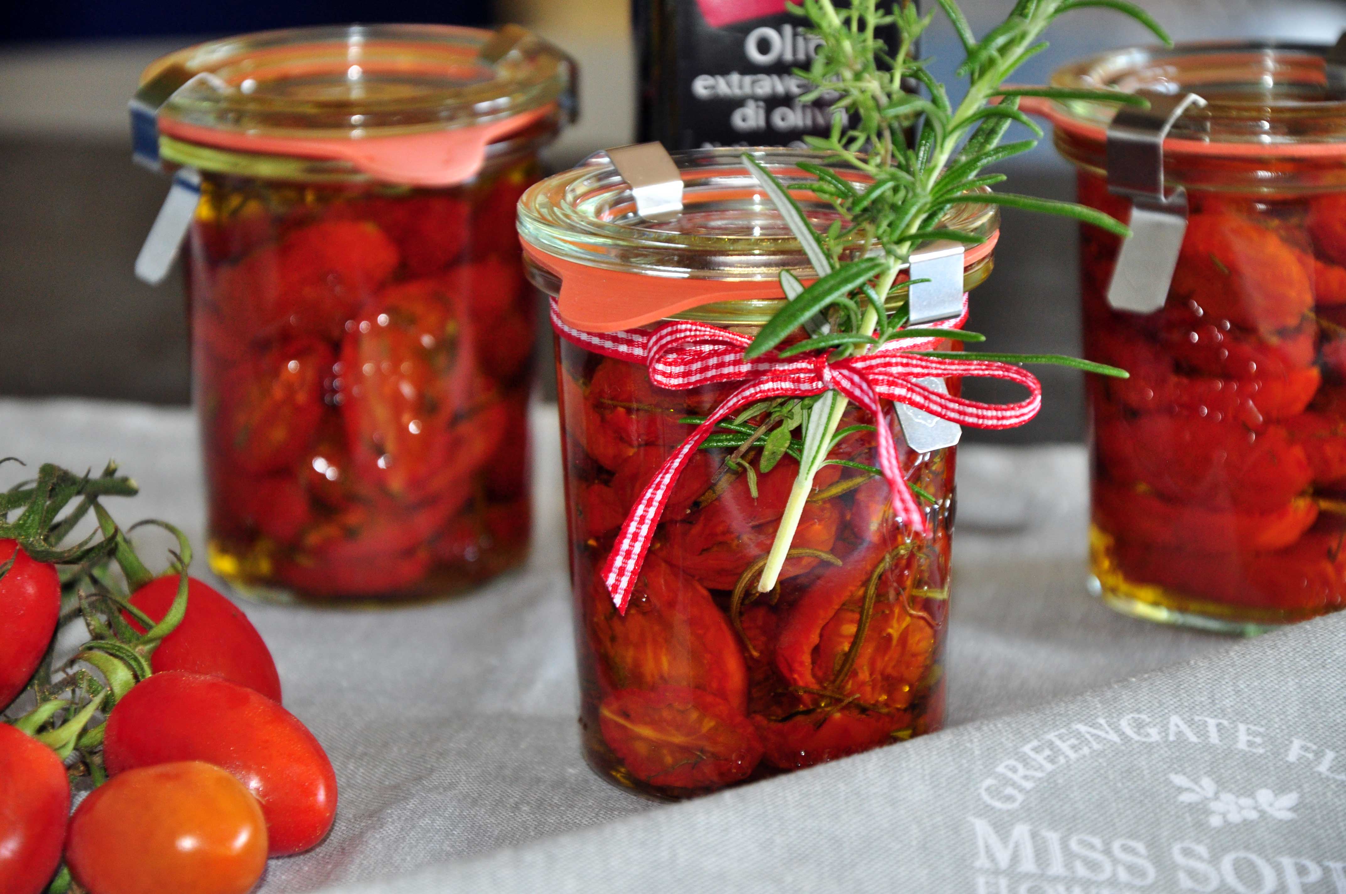 Tomaten im Backrohr bei 100°C Ober- und Unterhitze mind. 2 Stunden trocknen lassen. Die Tomaten dann abkühlen lassen und in Gläser füllen. Zum Schluss mit gutem Olivenöl auffüllen (es sollte alles bedeckt sein) und verschließen.