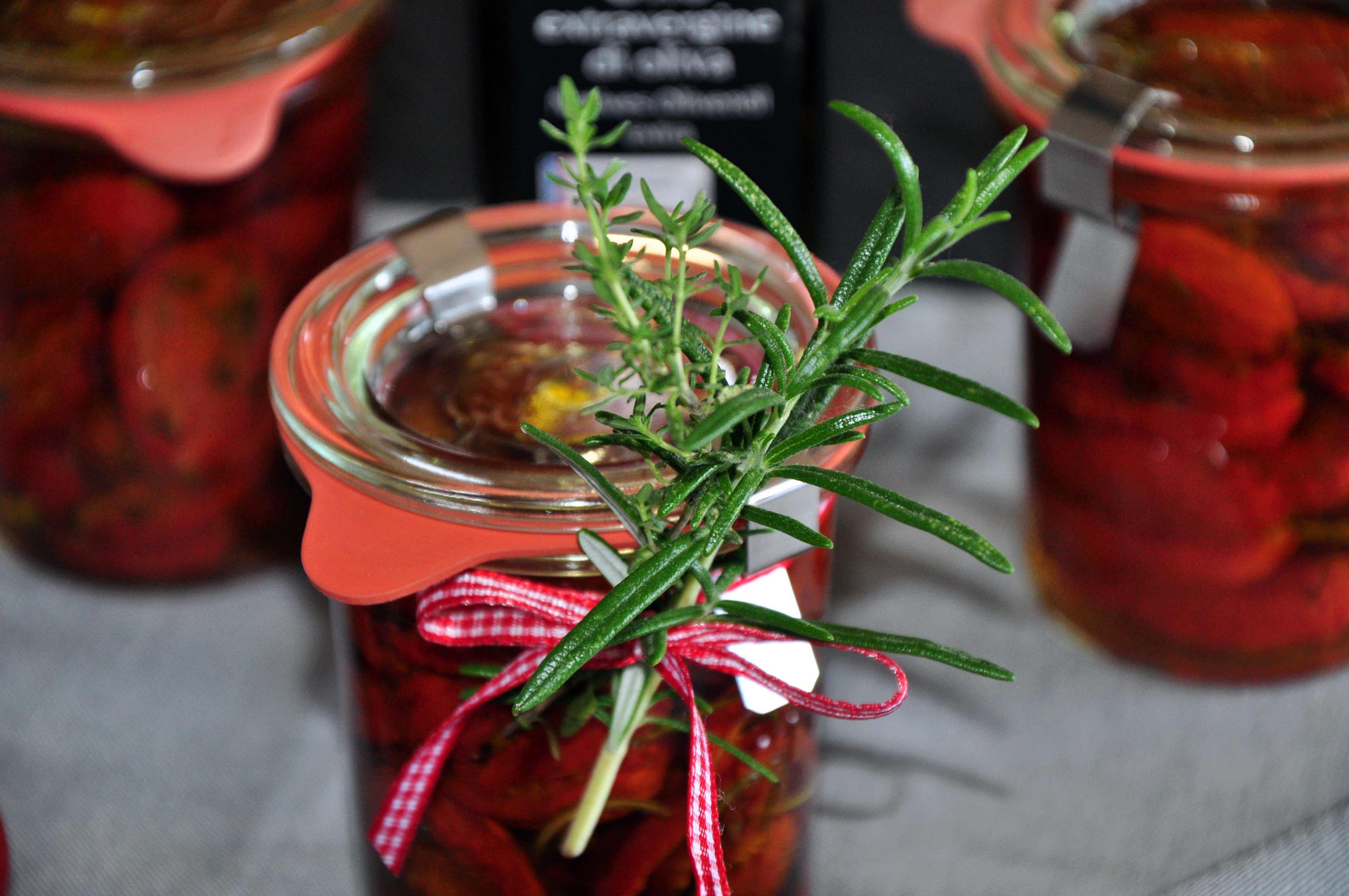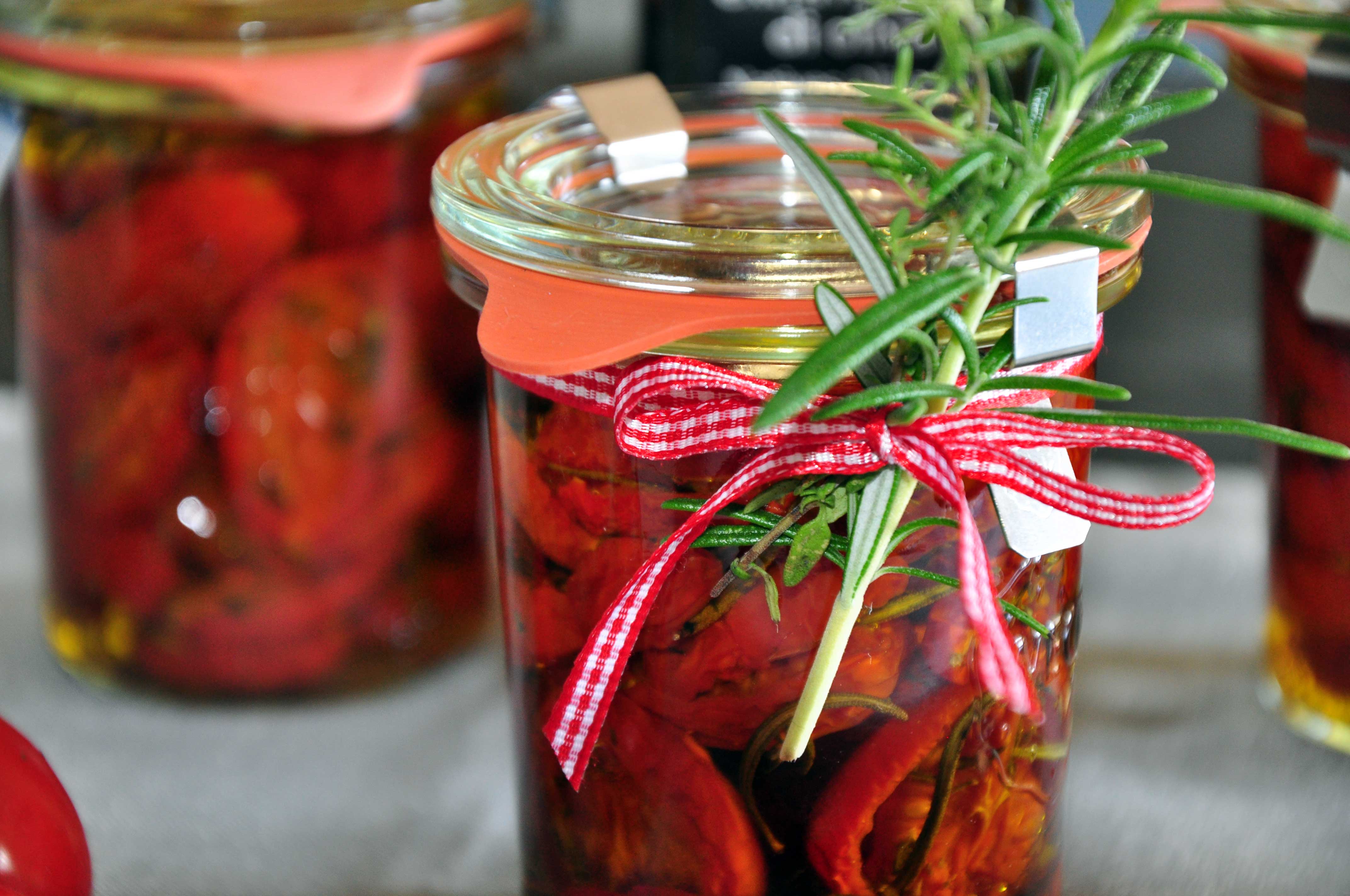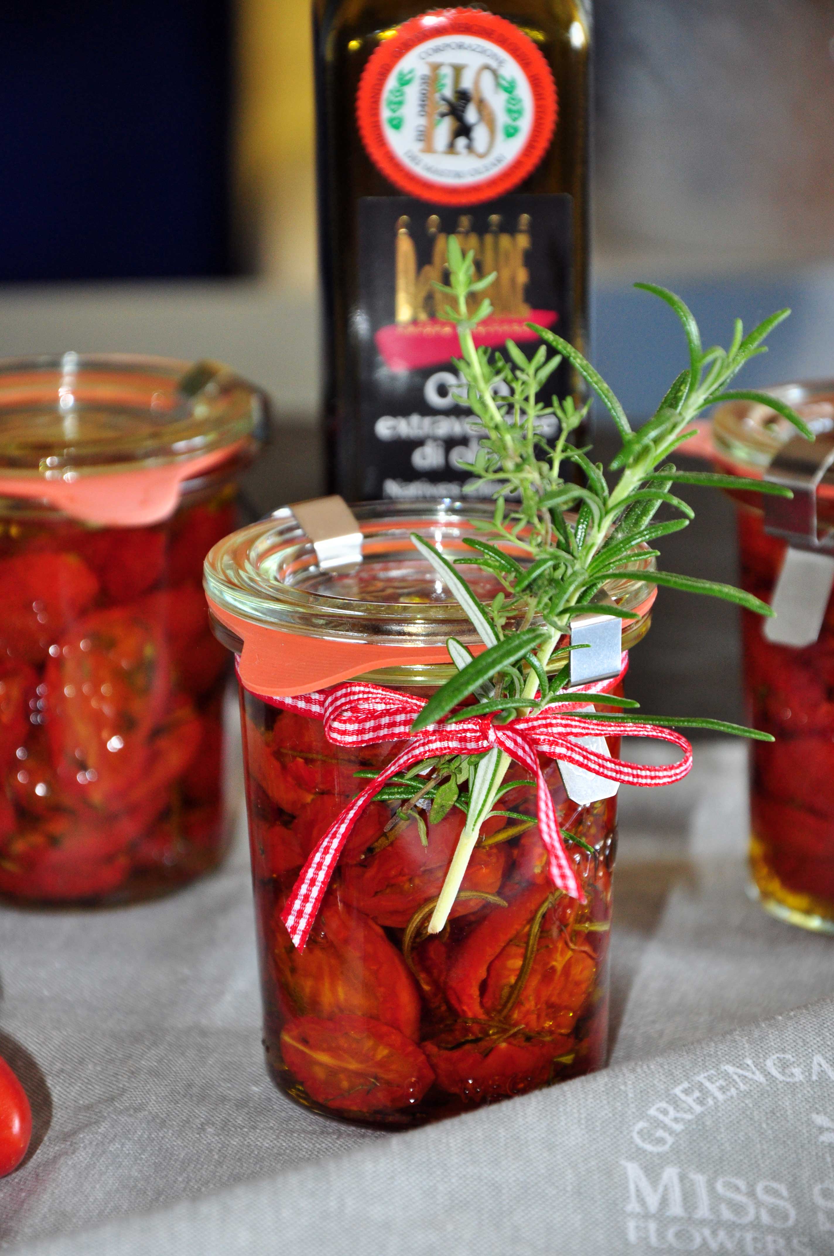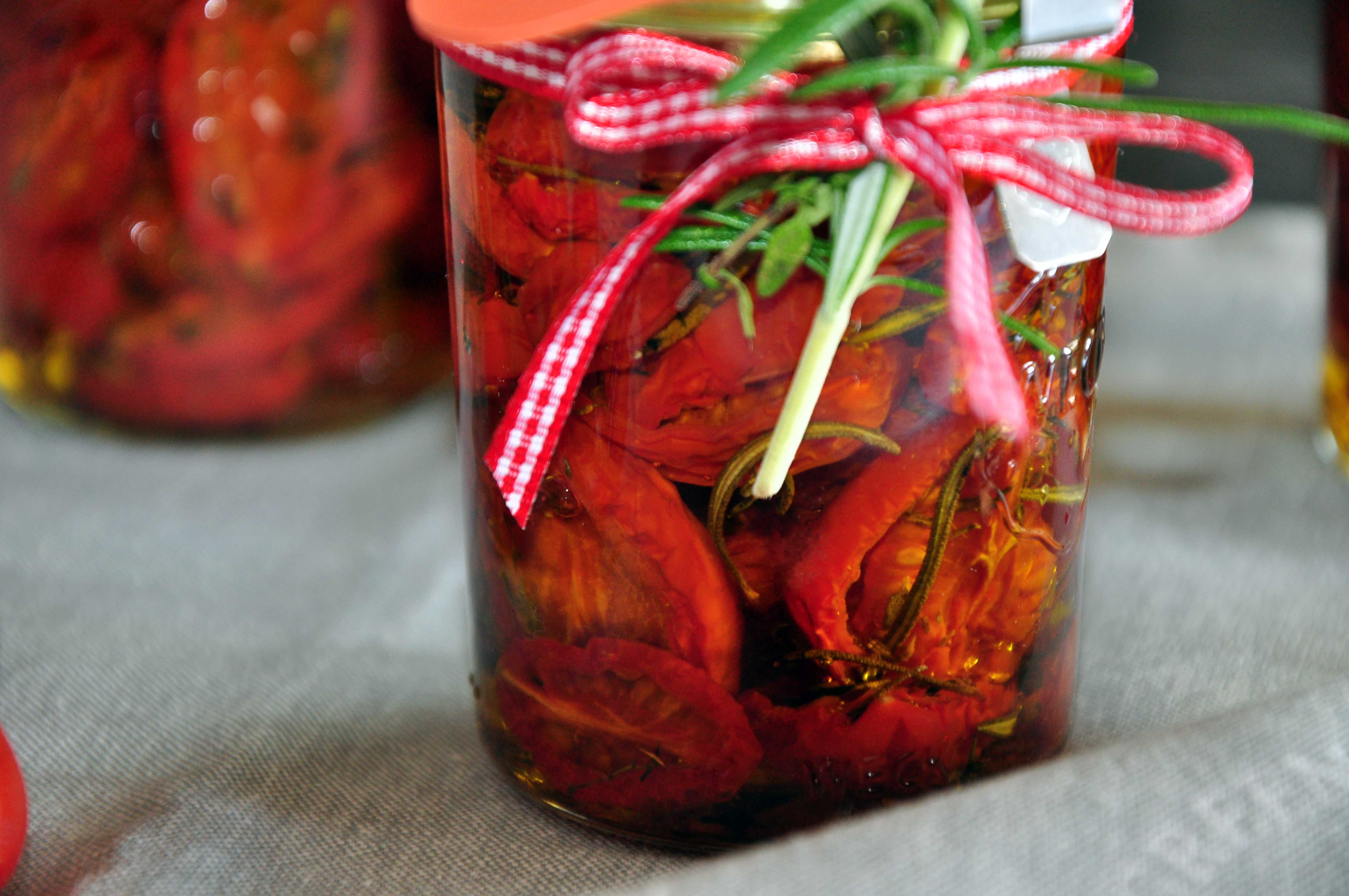 Tomaten im Backrohr bei 100°C Ober- und Unterhitze mind. 2 Stunden trocknen lassen. Die Tomaten dann abkühlen lassen und in Gläser füllen. Zum Schluss mit gutem Olivenöl auffüllen (es sollte alles bedeckt sein) und verschließen.