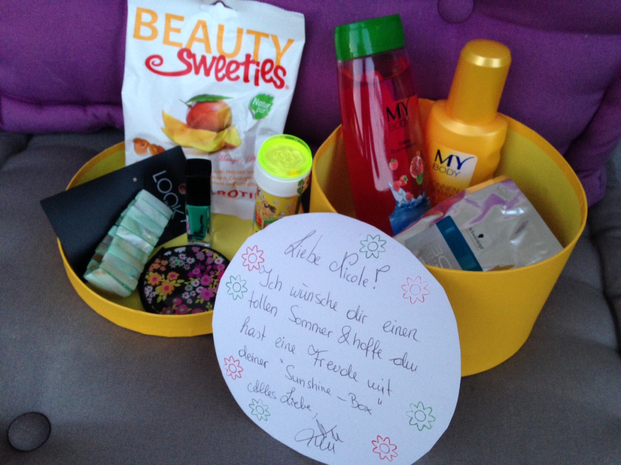 Voll die feinen Sachen waren da drin: ein kleiner Spiegel für die Strandtasche, Sonnenspray, Haarpflege nach der vielen Sonneneinstrahlung, ein sommerliches Armband, voll der stylische Nagellack, ein duftes Duschbad, fruchtige Fruchtgummis, ein Seifenblasenspender (sagt man so dazu) und liebe Worte von Alina! Vielen Dank!