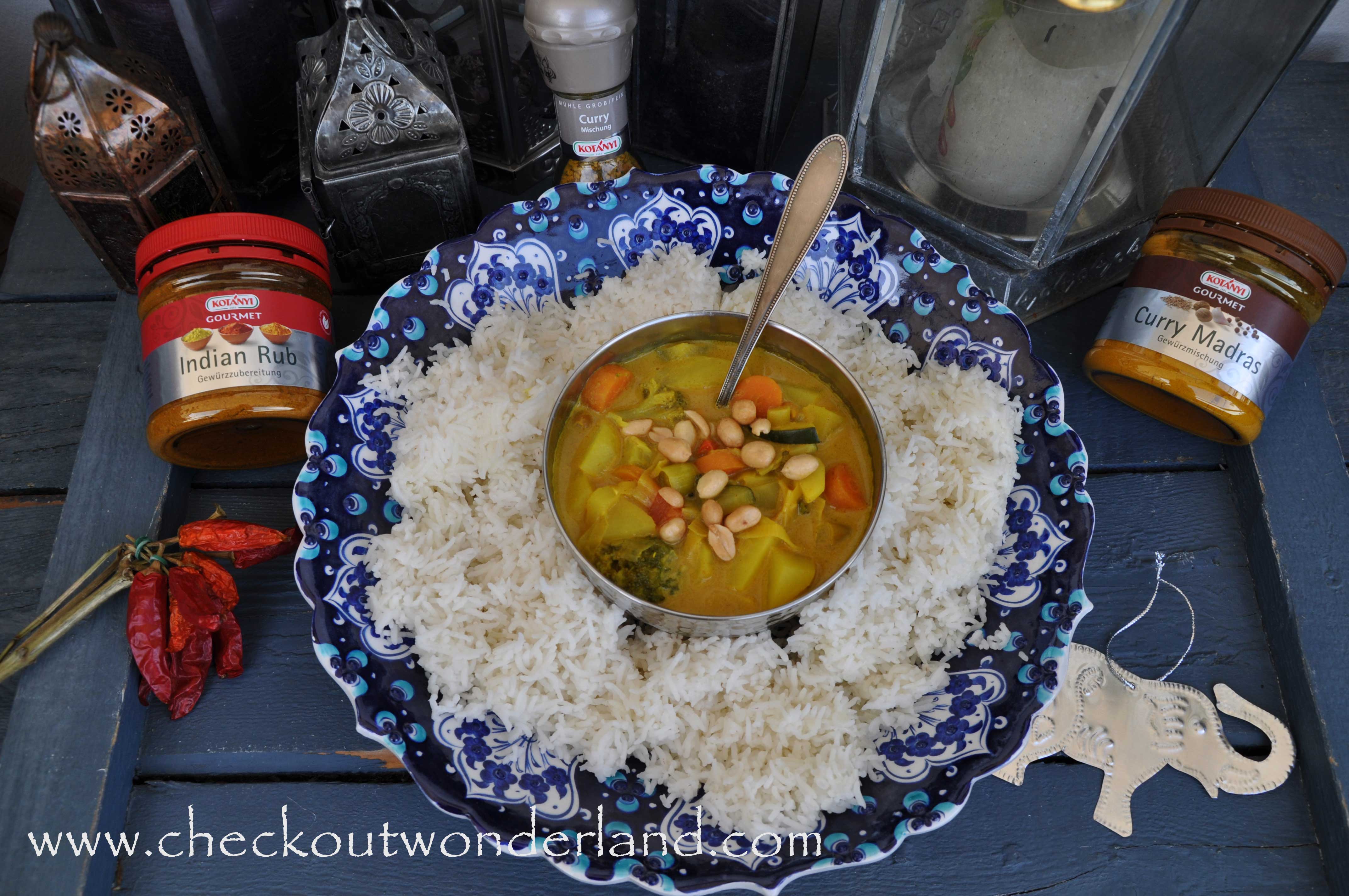 Curry-Gewürz (zB. 1 EL Kotanyi Indian Rub, 3 EL Kotanyi Curry Madras, etwas Kotanyi Curry Mischung)