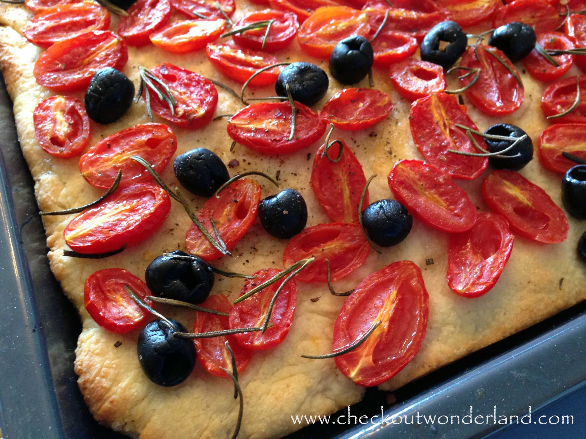 Germ und Honig im lauwarmen Wasser auflösen. Mehl, Grieß und Salz vermengen und in der Mitte ein Loch machen. Nun dreiviertel der Flüssigkeit dazugeben und zu einem geschmeidigen Teig kneten (entweder mit der Hand oder in der Küchenmaschine). Sollte der Teig zu trocken sein, dann noch die restliche Flüssigkeit dazugeben. Immer schön langsam herantasten…. Wenn der Teig fertig ist in eine große Schüssel geben und etwas Mehl darüber streuen und die Schüssel mit einem sauberen Geschirrtuch abdecken. Teig nun eine Stunde an einem warmen Ort gehen lassen und vor Zugluft schützen. Ich stelle die Schüssel immer in den (ausgeschalteten) Backofen auf den Boden. In der Zwischenzeit Tomaten waschen und halbieren. Oliven abtropfen lassen und Rosmarin vorbereiten. Nach einer Stunde kann der Teig dann heraus. Er sollte nun die doppelte Menge haben. Teig nun nochmal vorsichtig durchkneten und auf ein mit Olivenöl ausgefettetes Backblech auslegen/ausrollen. Am besten mit den Händen reindrücken. Nun mit etwas Olivenöl bestreichen und mit Tomaten, Oliven und Rosmarin bestreuen. Zum Schluss noch etwas Salz und Pfeffer drüber geben. Nun darf der Teig noch eine weitere Stunde aufgehen. Am besten das Blech nun auch wieder in den Backofen geben. Nach einer Stunde das Backrohr auf 180°C einschalten und ca. 45 Minuten backen. Aus dem Rohr nehmen und abkühlen lassen. Nun könnt ihr die Focaccia in Stücke schneiden. Fertig ist der perfekte Snack für einen kuscheligen Abend mit Freunden.