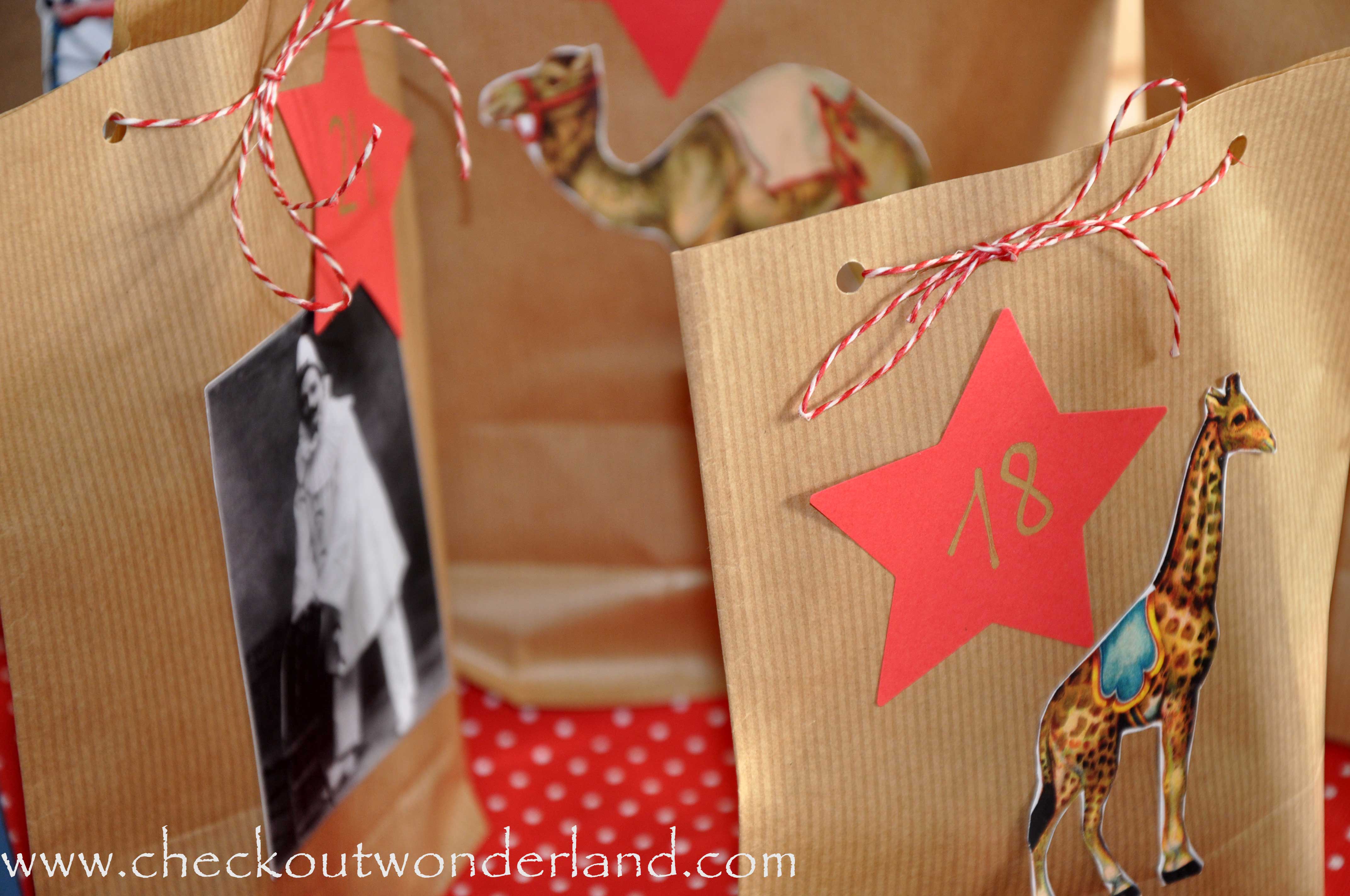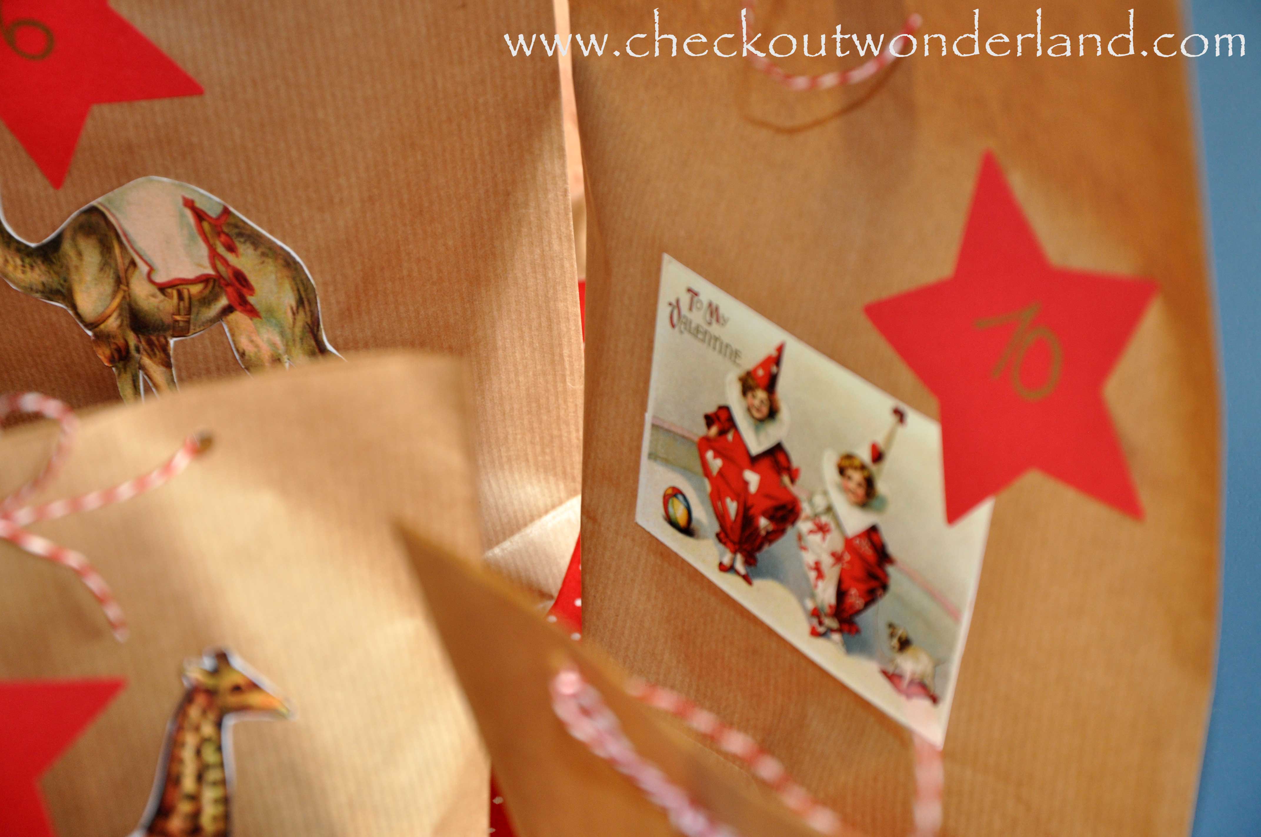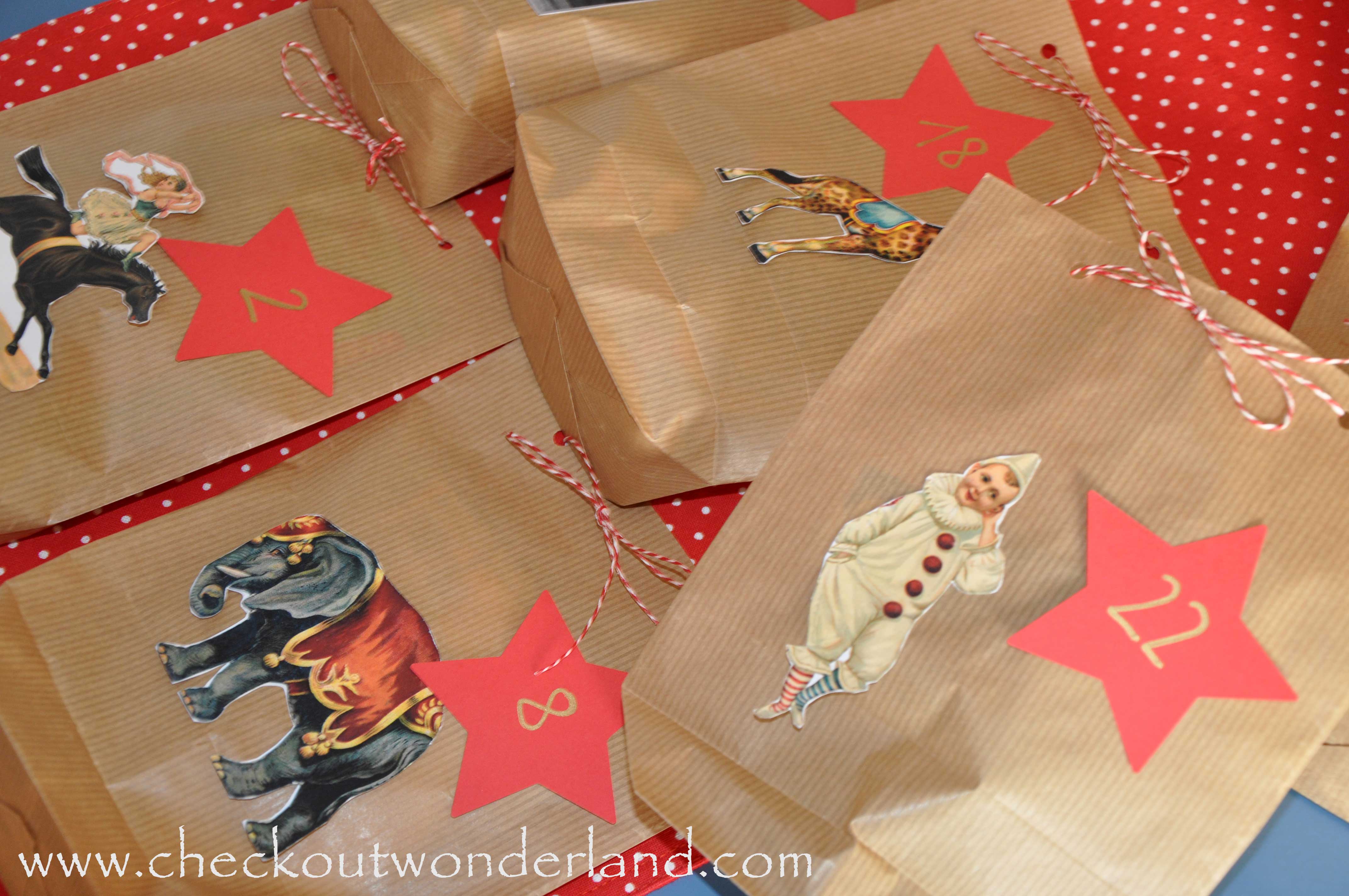 Also ich hatte die geraden Tage zu befüllen. Verpackt habe ich alles in braunen Bodensäcken mit lustigen nostalgischen Zirkusmotiven von The Graphics Fairy beklebt. Schaut einfach mal rein. Diese Seite ist wirklich eine wahre Inspiration. Das Zirkusmotiv habe ich deshalb gewählt, da es ein bisschen ein Kontrast zur Weihnachtszeit ist und um sich von der Masse etwas abzuheben. Es soll ja ein besonderer und einmaliger Kalender sein. Die roten Sterne habe ich mit einem Motivstanzer gemacht und die jeweilige Zahl mit Goldstift darauf notiert.