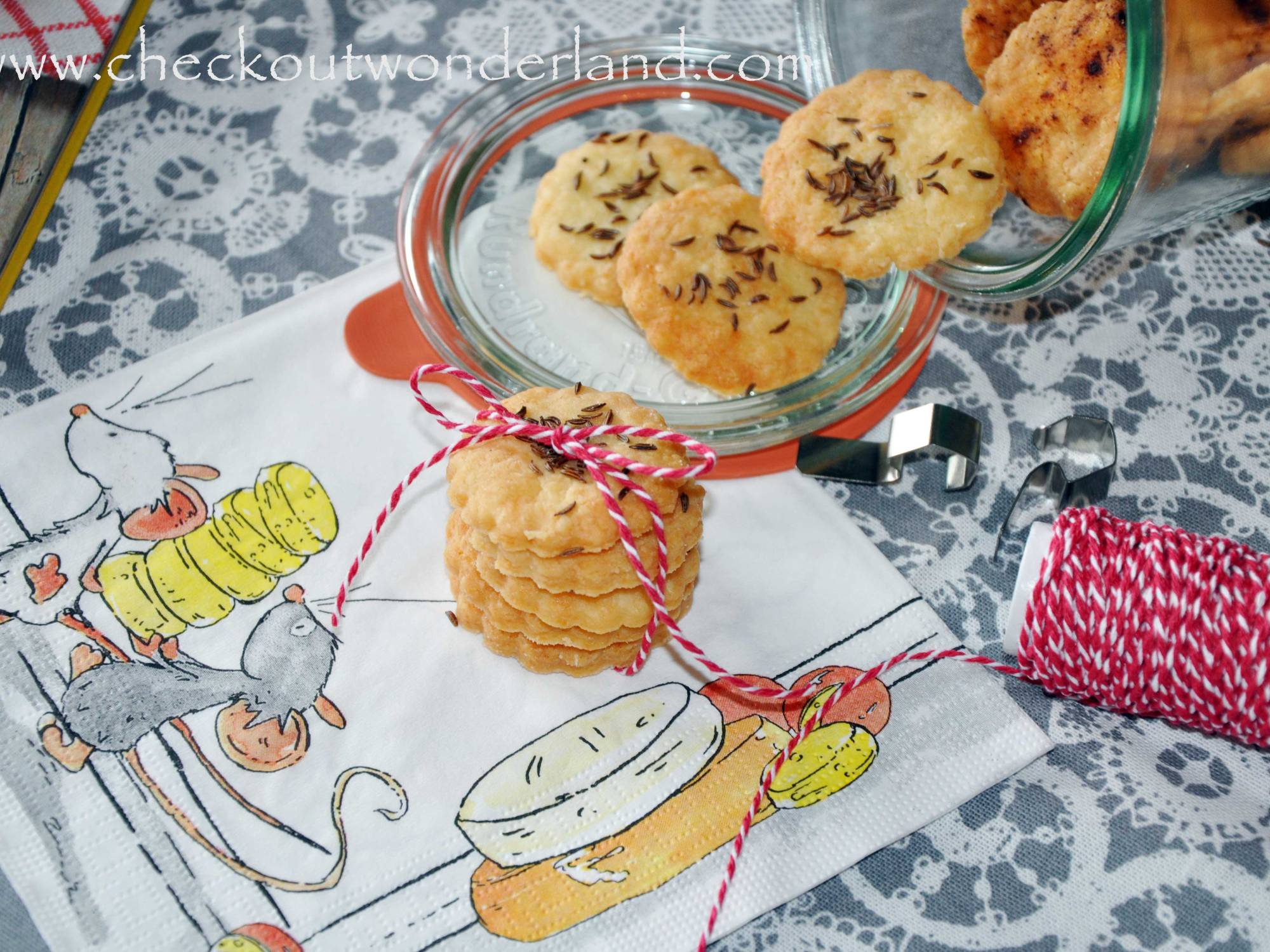 Alle Zutaten in einer großen Schüssel verrühren, bis ein (relativ klebriger) Teig entsteht. Den Teig in Küchenfolie wickeln und mindestens 30 Minuten durchkühlen. Den Ofen auf 180°C (Ober- und Unterhitze) vorheizen. Den Teig auf eine bemehlte Oberfläche legen, mit Küchenfolie bedecken und dünn ausrollen. Dann mit einem Teigrad längliche Scheiben schneiden oder mit einem Keksausstecher die jeweilige Form ausstechen. Die Kekse nun auf ein mit Backpapier ausgelegtes Backblech legen, mit zB Kümmel bestreuen und etwa 10 Minuten backen, bis sie Farbe annehmen und fest werden.