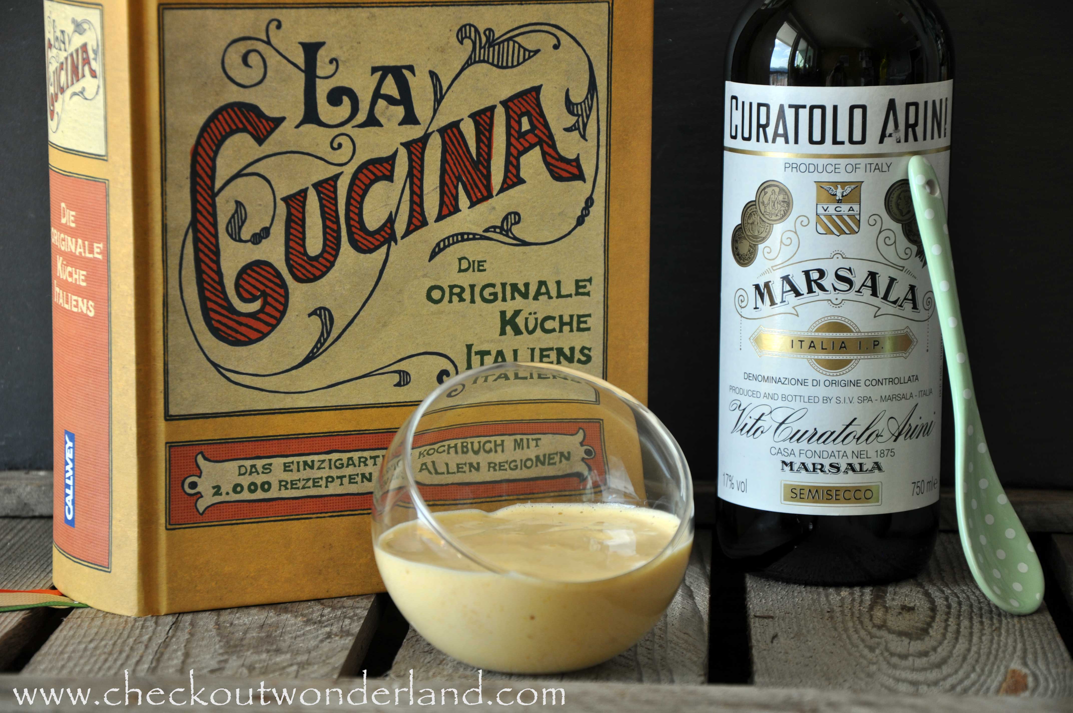 Die Eigelbe mit dem Zucker in einer Kasserolle schaumig schlagen und langsam Marsala dazugießen. Die Mischung auf einem Wasserbad so lange schaumig rühren, bis sie beinahe kocht. Etwas abkühlen lassen.