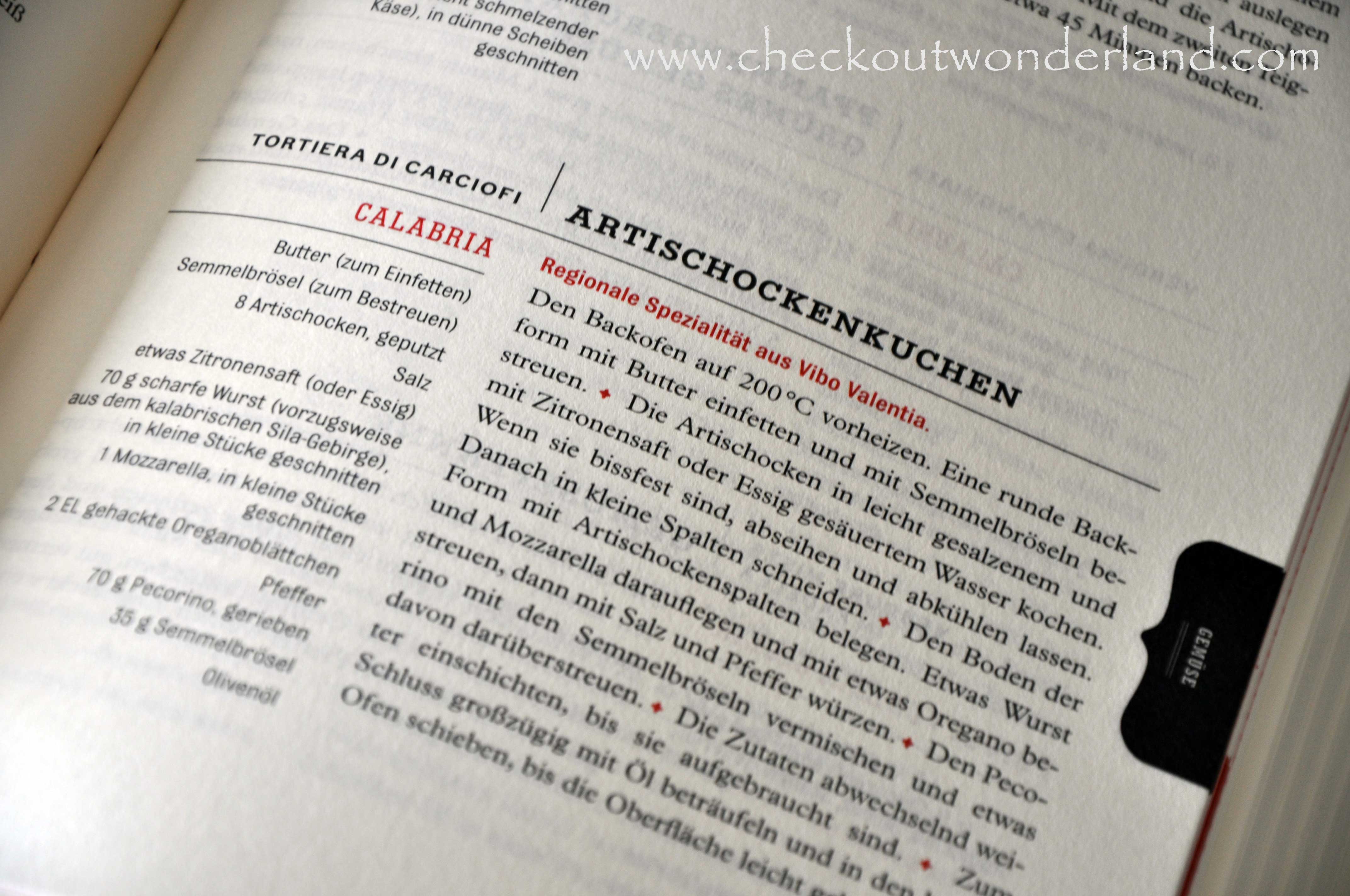 Antipasti, Pizza, Saucen, Suppen, Pasta, Polenta, Reis, Fisch, Fleisch, Geflügel, Gemüse, Käse und Desserts – so ist das Inhaltsverzeichnis gegliedert. Alles was das Herz begehrt. Wie wäre es mit einer kalabrischen Wildzwiebelsuppe, überbackenen Makkaroni, Ricottakuchen oder Püree aus dicken Bohnen. Ein Buch wie Urlaub.